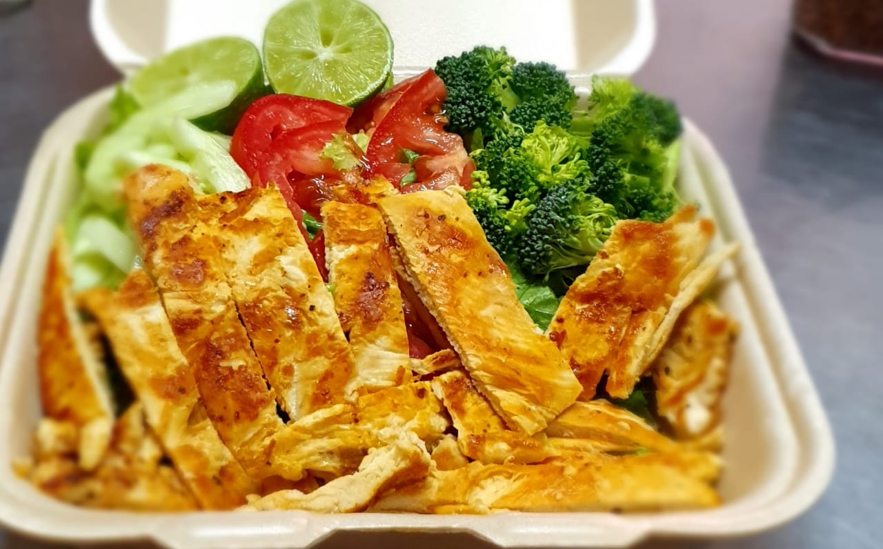 Pechuga asada servida con ensalada de lechuga tomate pepino brócoli