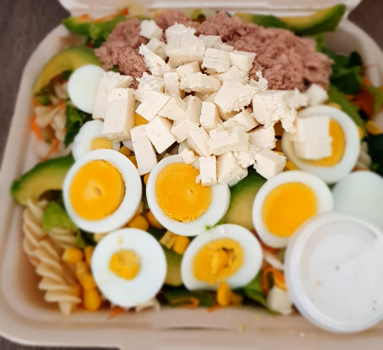 mezcla de lechugas, espinaca, zanahoria rayada, pepino, elote, pimiento verde y rojo, apio, jicama, aguacate, queso fresco, pasta, atun, huevo hervido.