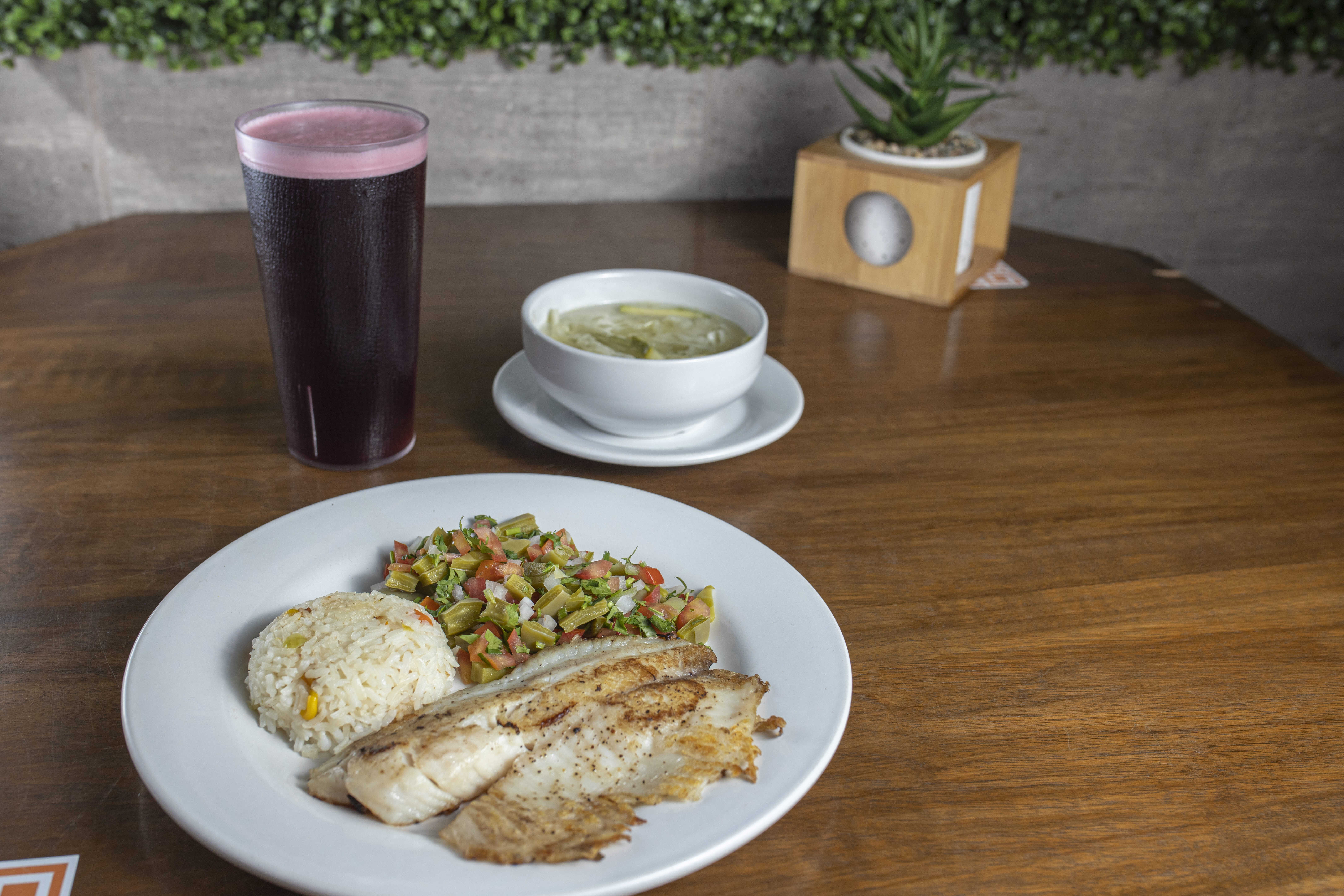 Ensalada*1 + A la Plancha 130 g*1 + Agua de Jamaica*1 + Sopa Verde*1