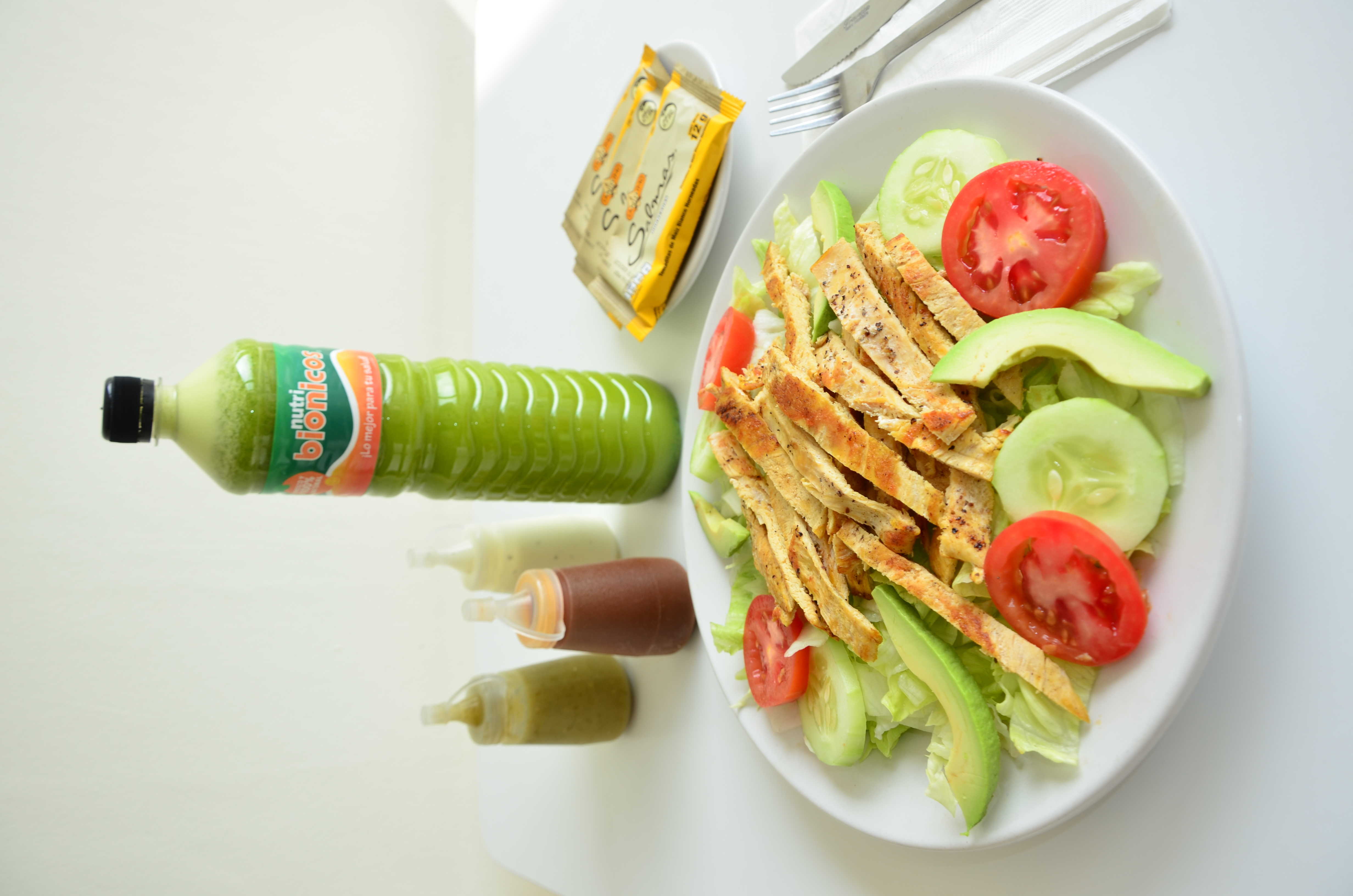Lechuga, jitomate, aguacate, pepino y fajitas de pollo salpimentadas a la plancha.
