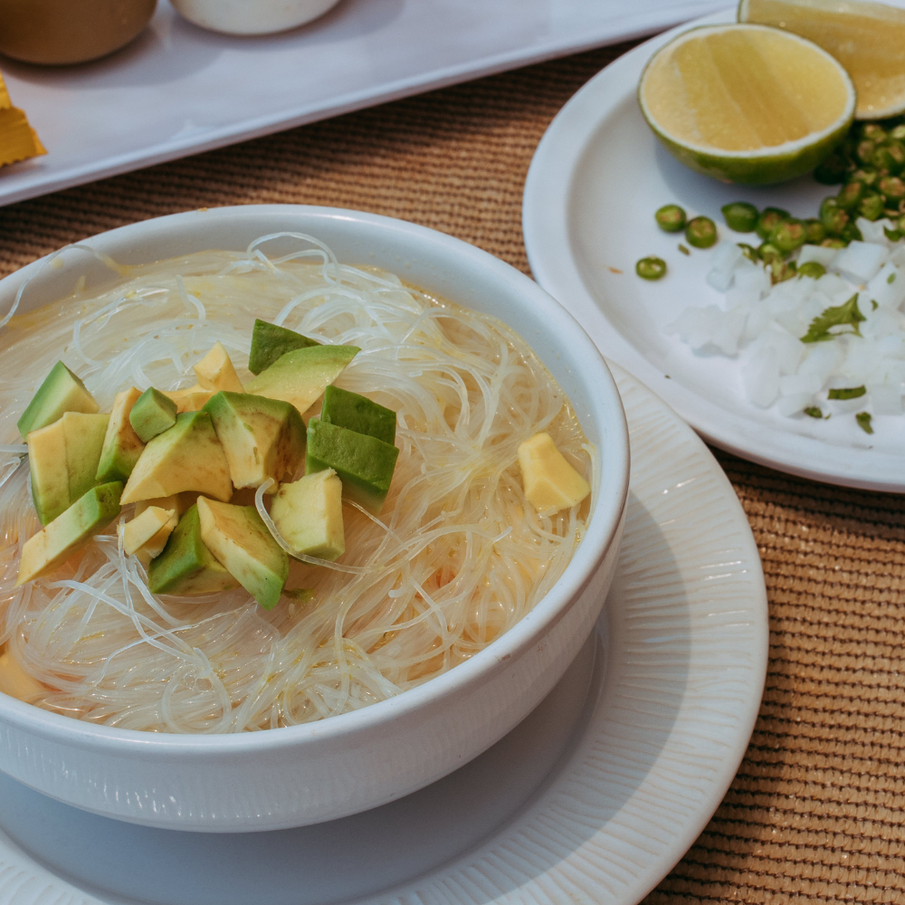 Pollo, verduras, queso, aguacate y fideos chinos.