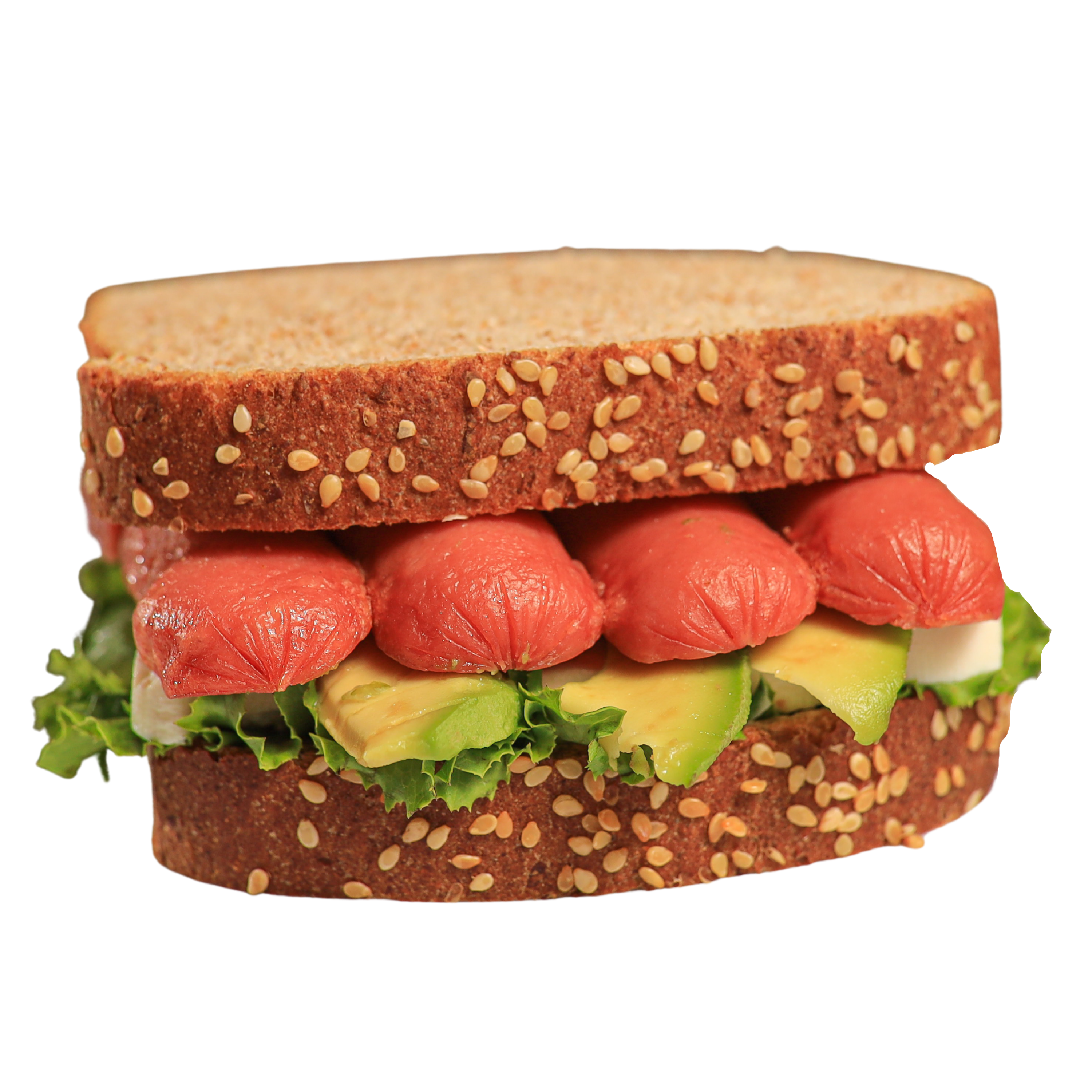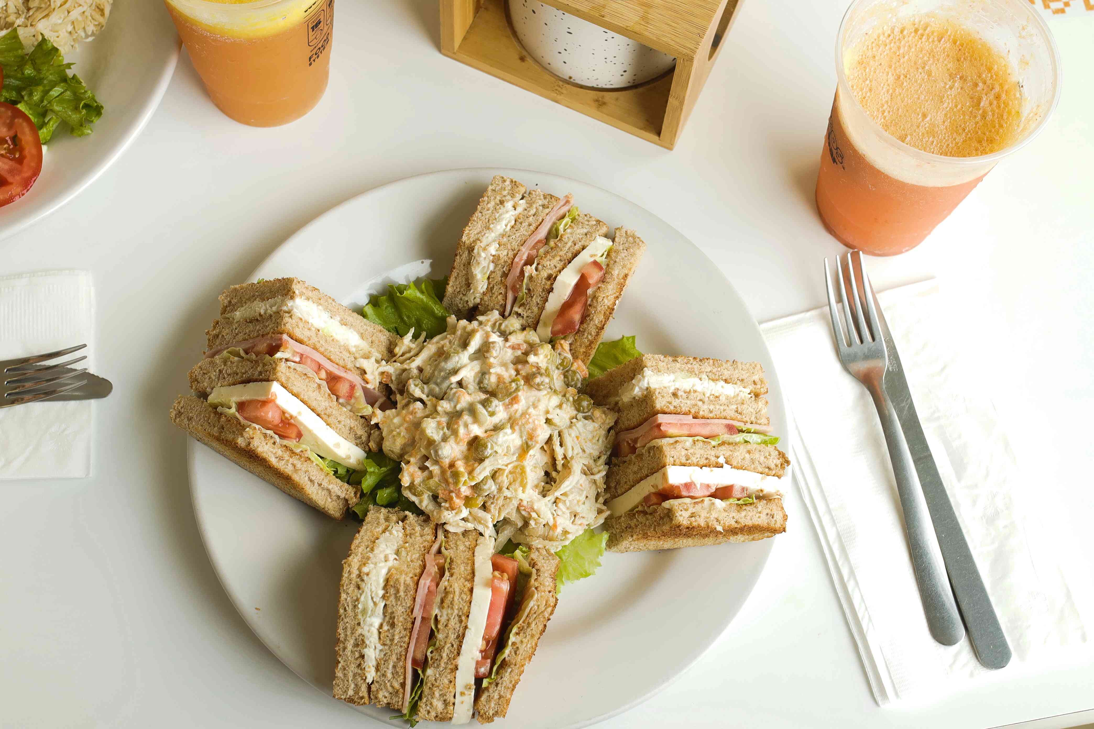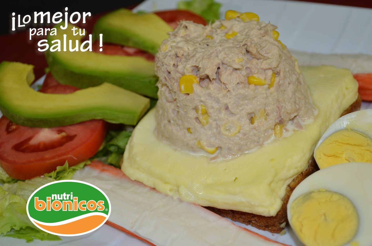 Atún, mayonesa, elote, pan integral, queso fundido, lechuga, jitomate, surimi, aguacate y huevo hervido.