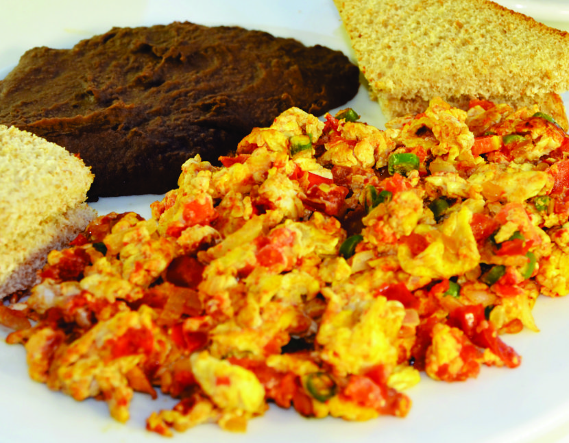 Omelette de huevos biónicos, acompañado de frijoles y salmas.