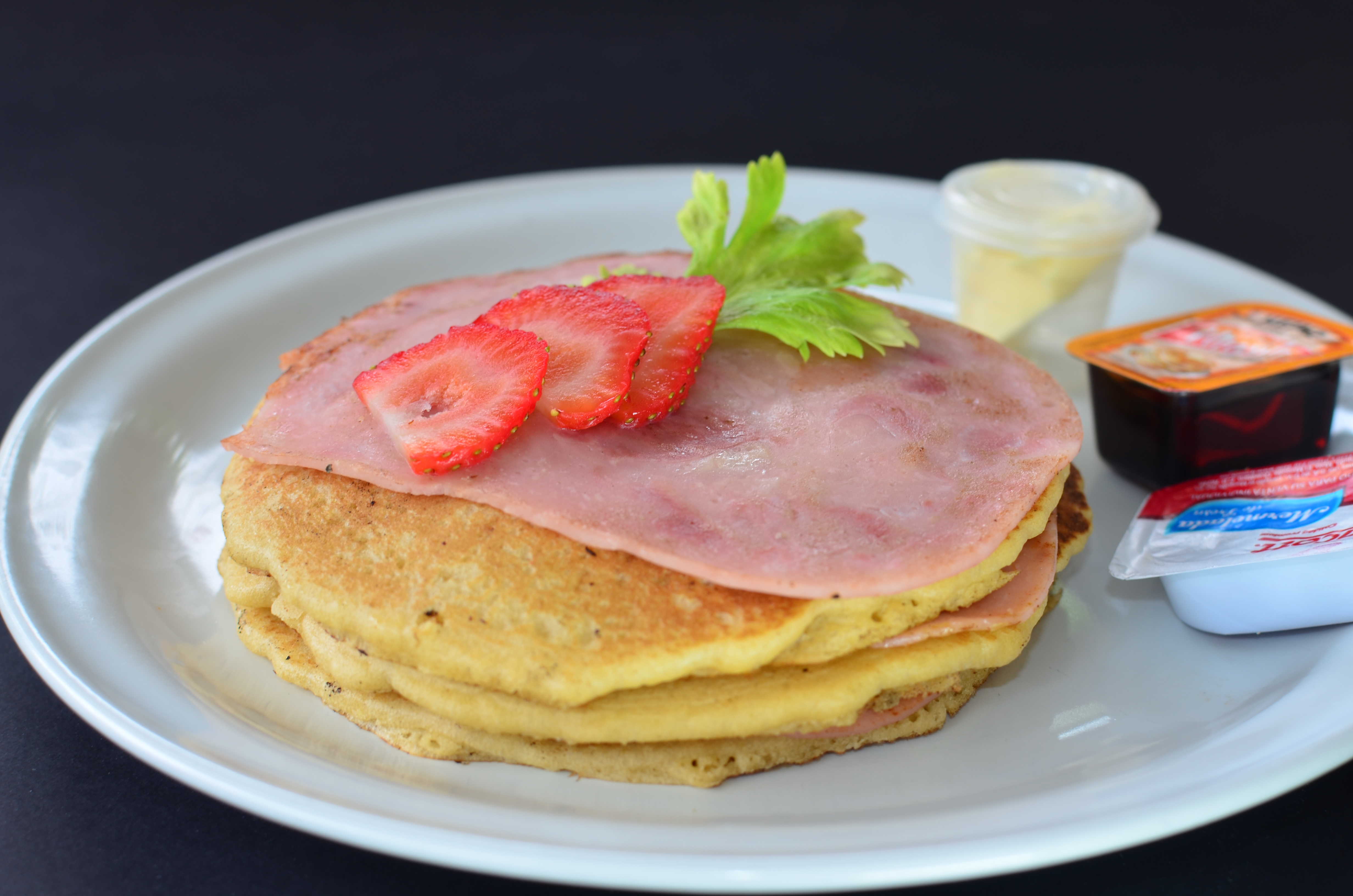Hot cakes acompañados de jamón de pavo, con topping de fresa, orden de 3 pzas.