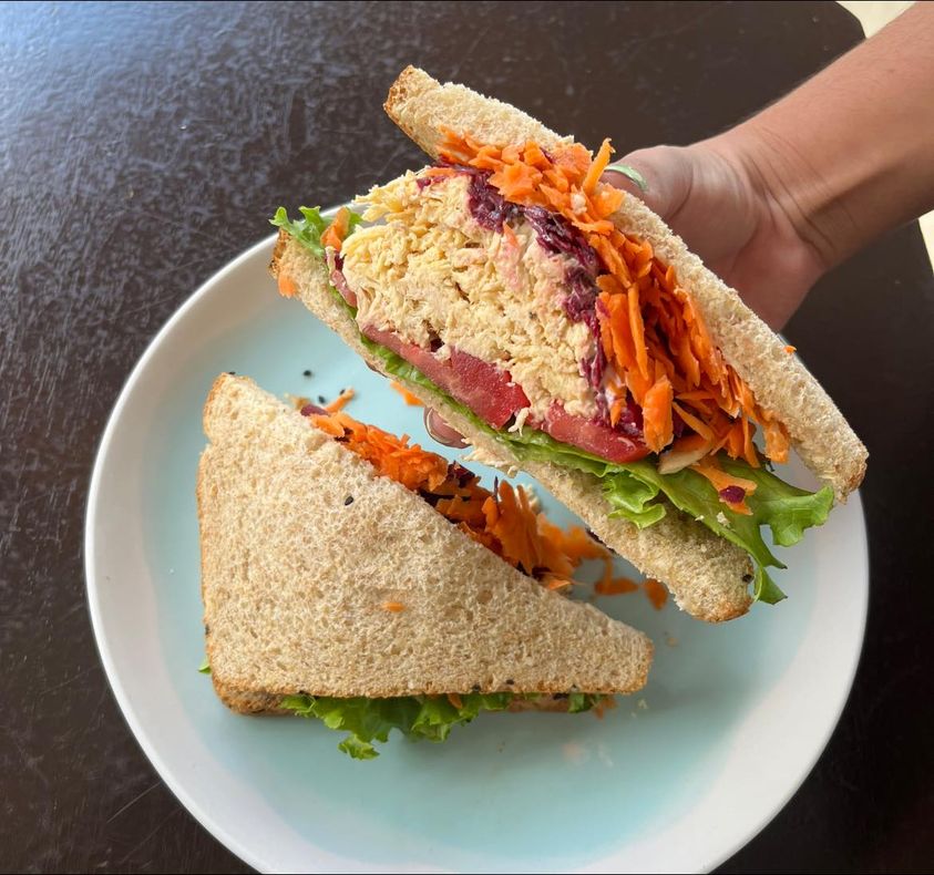 Pan integral tostado, atún, espinaca, pepino, cebolla morada y aceite de oliva.