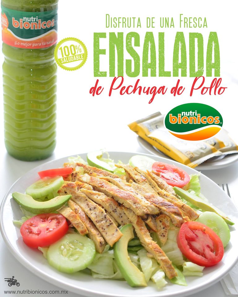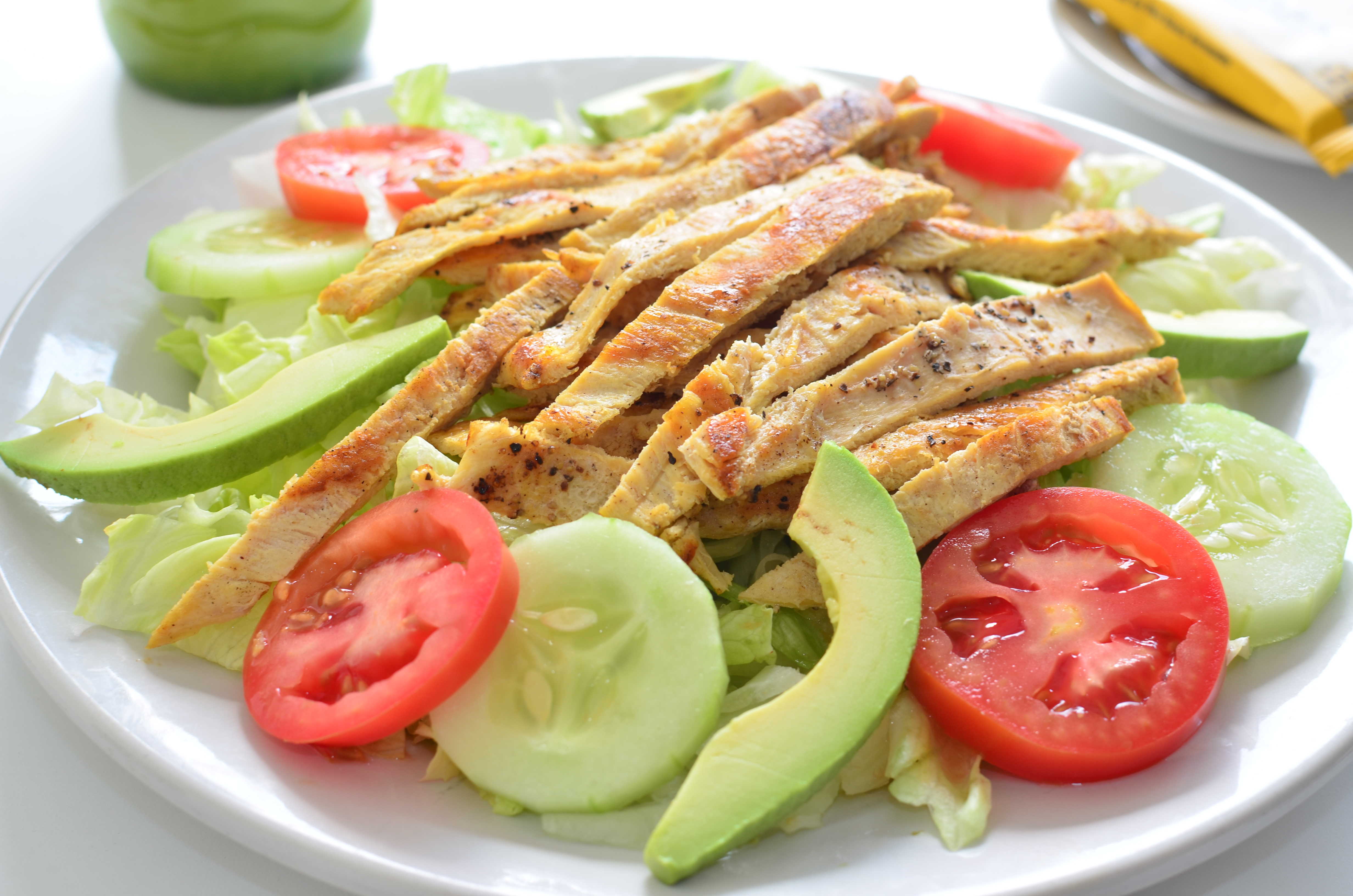 Lechuga, jitomate, aguacate, pepino y fajitas de pollo salpimentadas a la plancha.