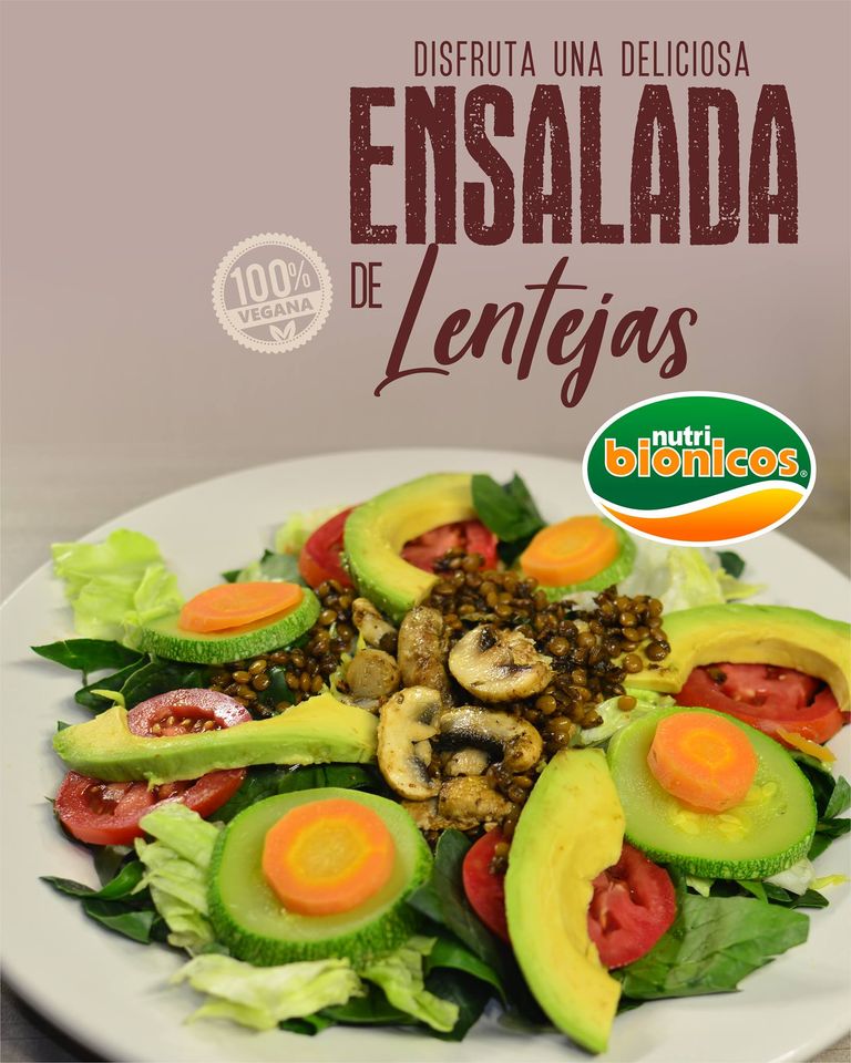 Lentejas, zanahoria, champiñones, jitomate, calabacita, lechuga, espinaca y aguacate.