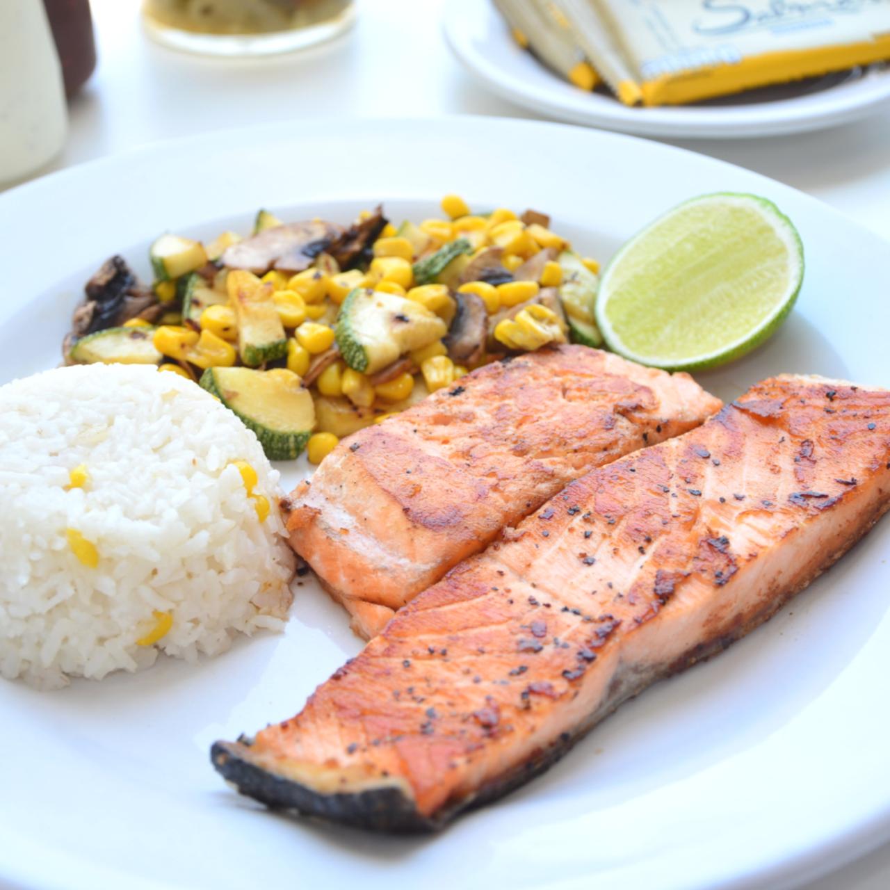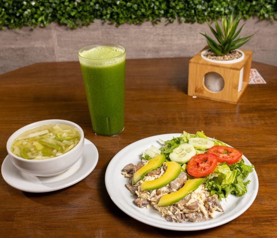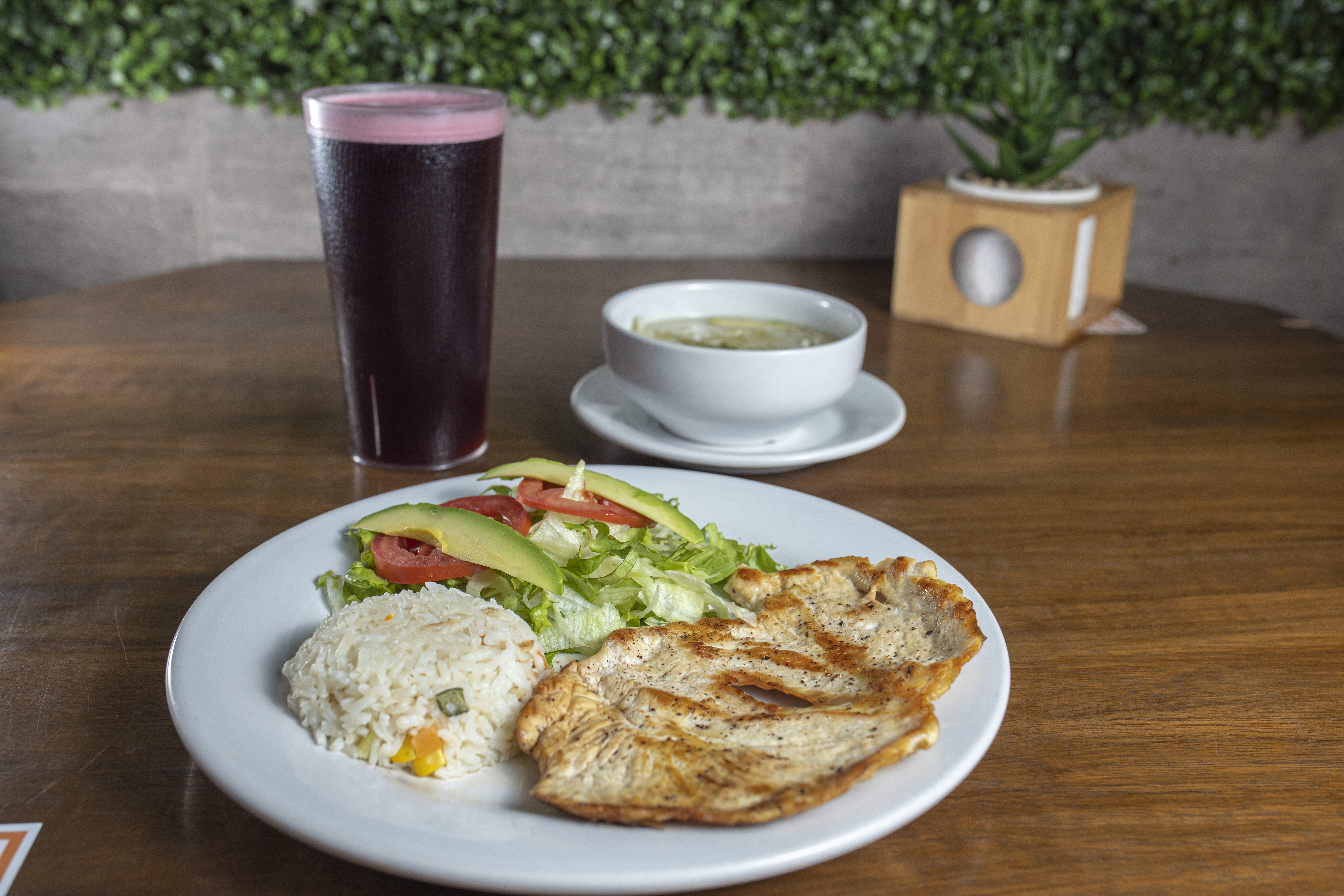 Pollo 130g o pescado 150g peso en crudo, con arroz, una ensalada a elegir, sopa verde y agua de Jamaica 500ml.