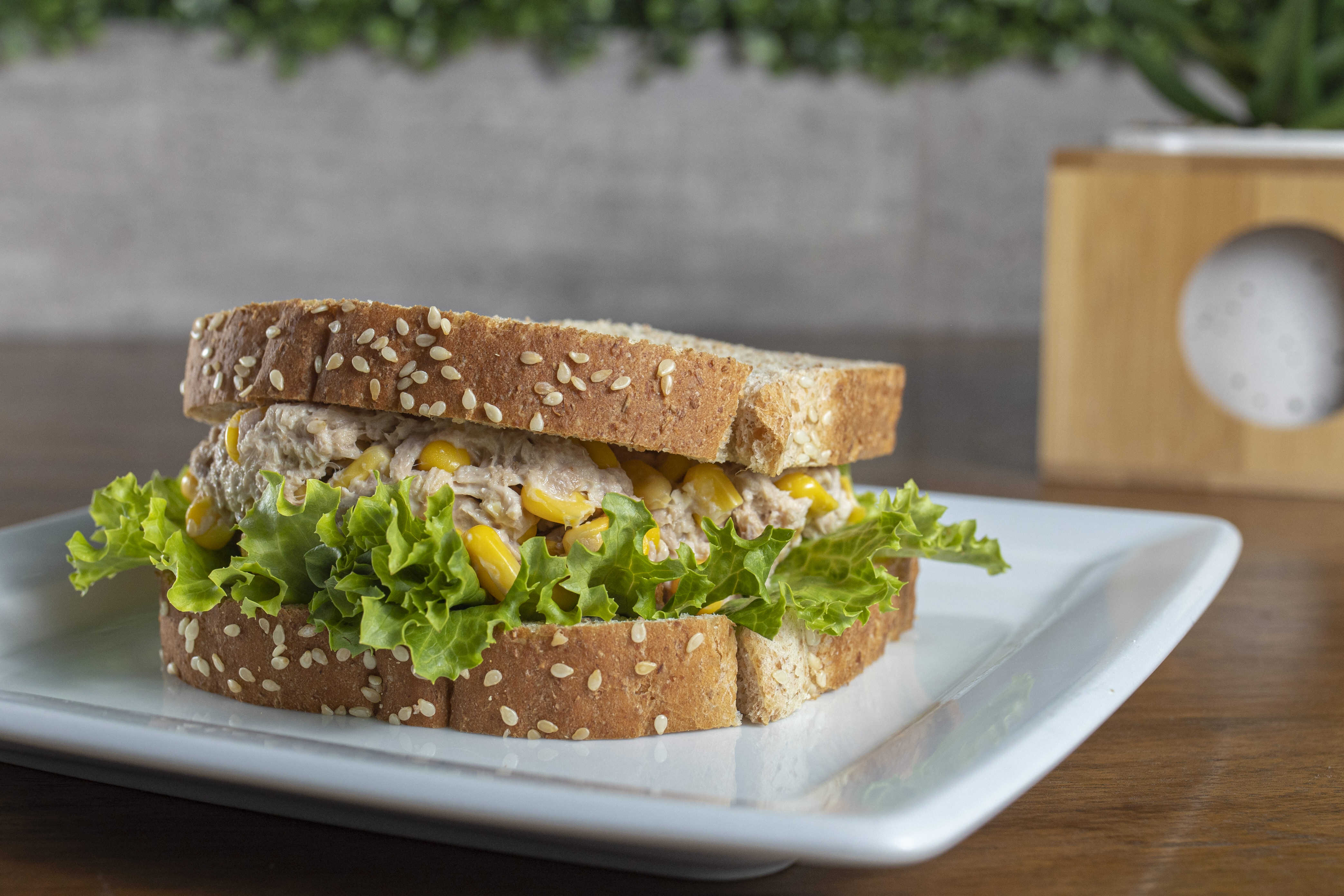 Pan integral, atún con elote, aderezado con mayonesa, lechuga y jitomate.