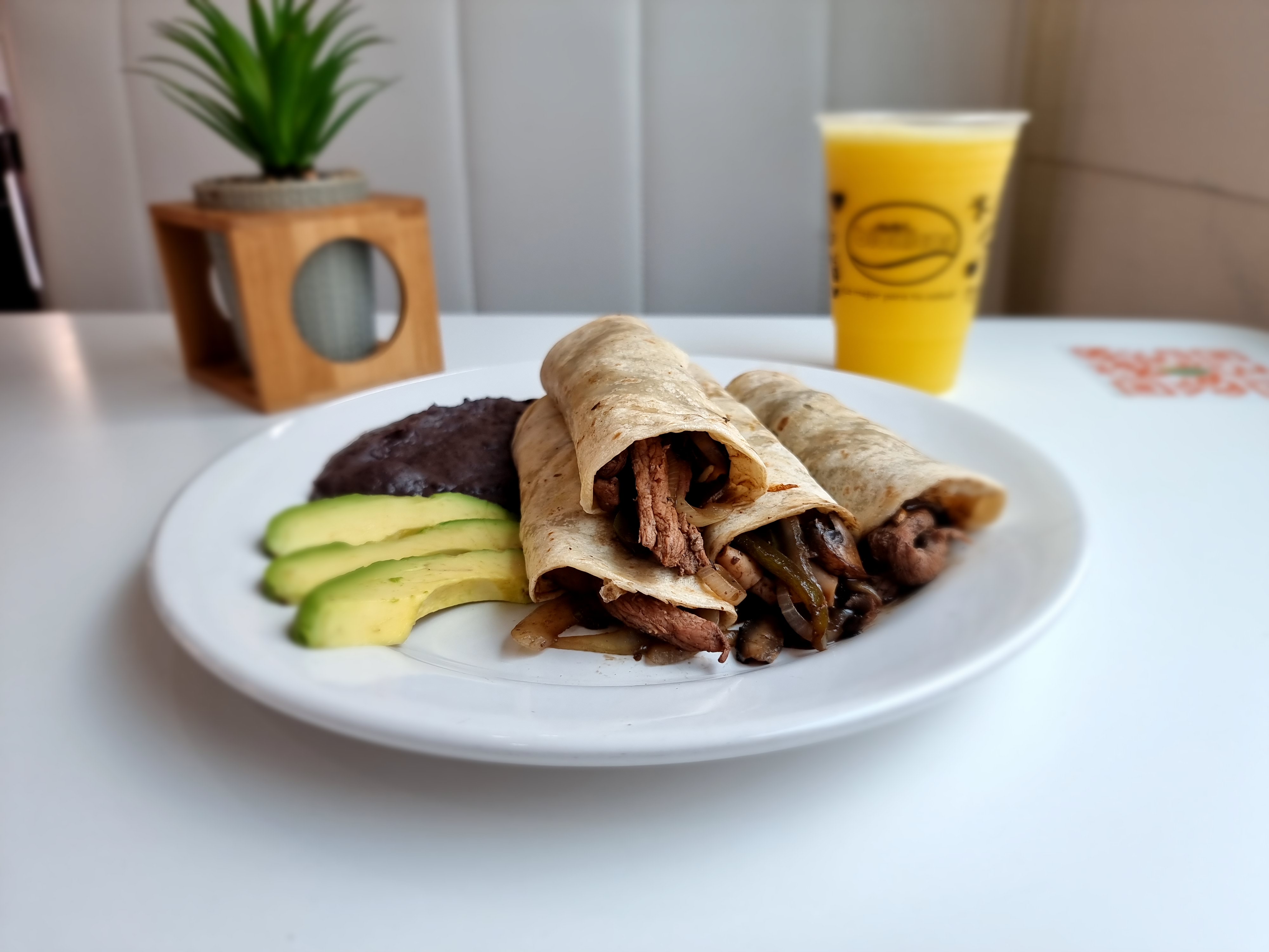 Con tortilla de harina, champiñón, pimiento, cebolla blanca, jamón, guarnición de frijoles y aguacate, 4 pzas.