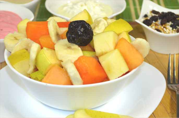 Ensalada de 4 frutas con yogurt de fresa ó natural y 3 cereales.