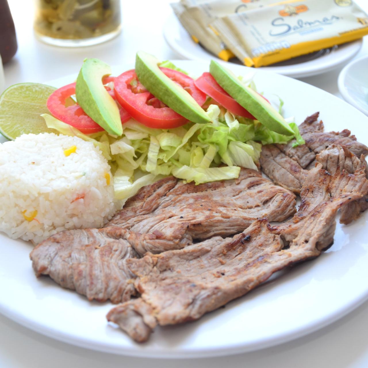 Con arroz, una ensalada a elegir, sopa verde y agua de jamaica 500 ml.