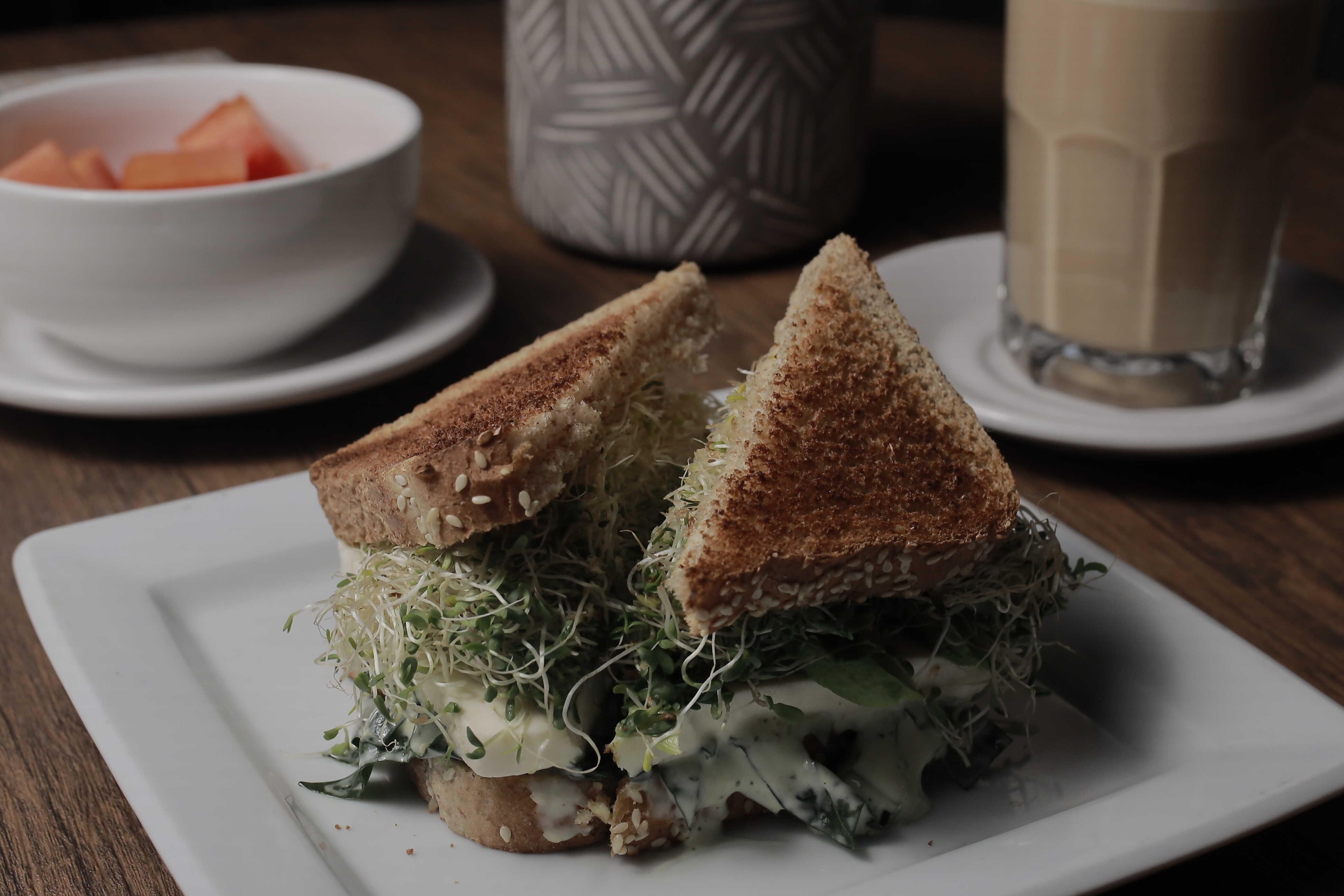 Pan integral tostado, germinado de alfalfa, queso panela, espinaca, aguacate, lechuga romana y aderezo verde.