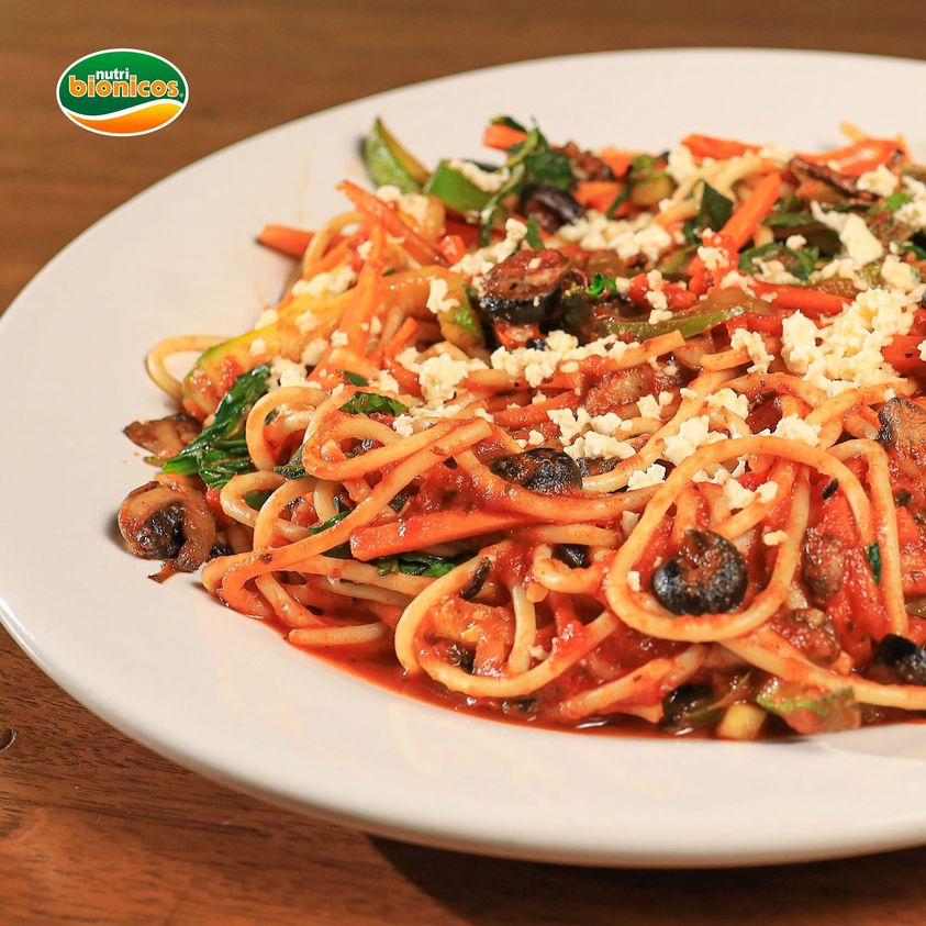 Espagueti, zanahoria, calabacita, pimiento morrón, espinaca, aceituna, champiñón, queso panela y salsa de tomate.