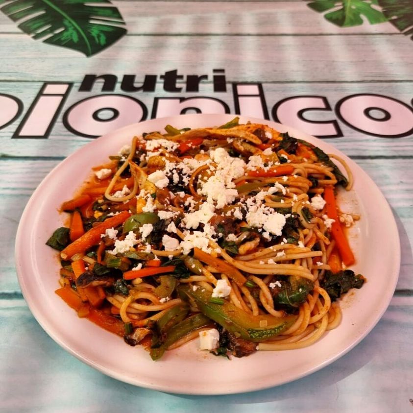 Espagueti, pollo, zanahoria, calabacita, pimiento morrón, espinaca, aceituna, champiñón, queso panela y salsa de tomate.
