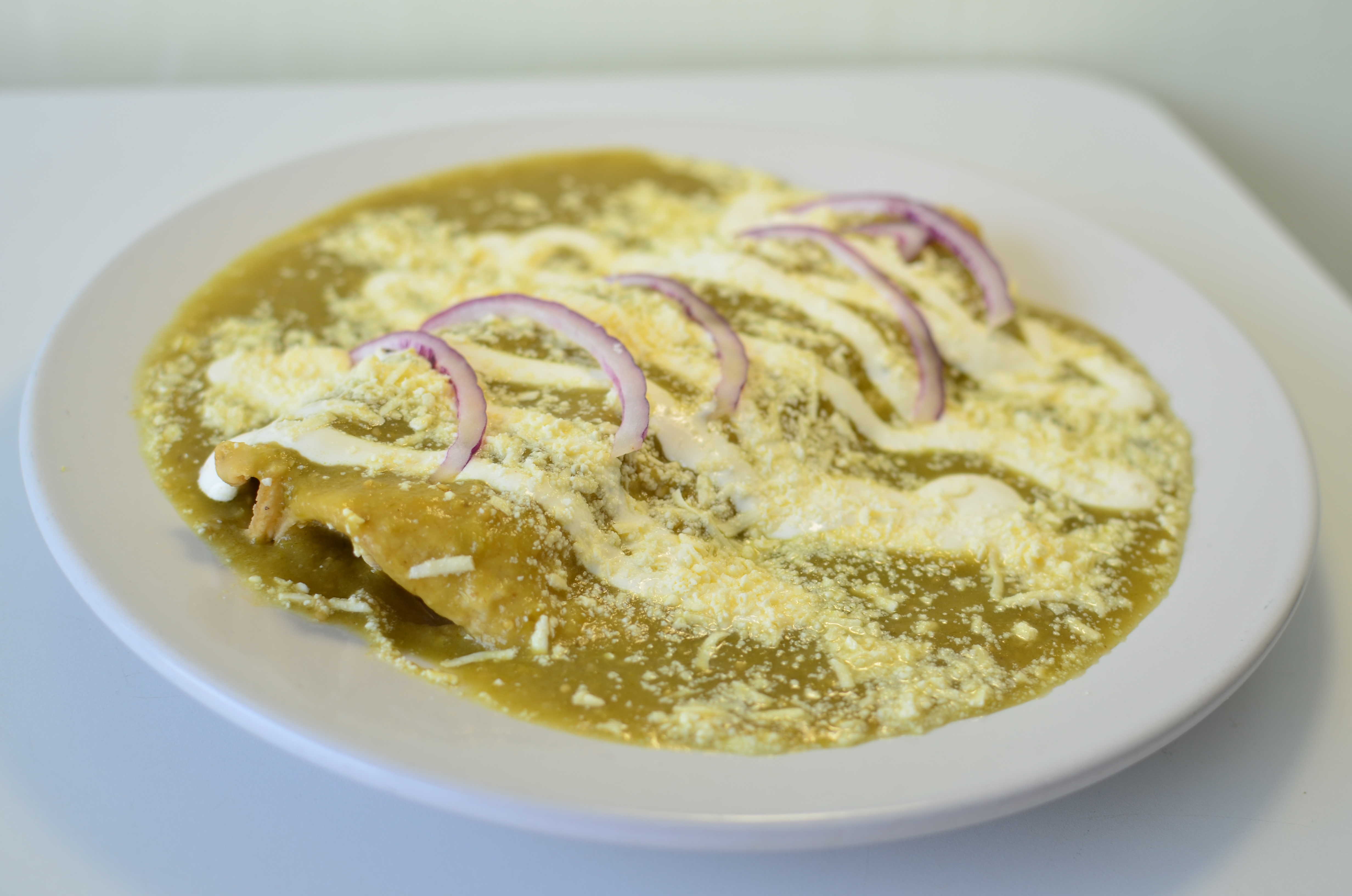 Enchiladas verdes acompañadas con pollo ó requesón, cebolla, queso panela y crema.