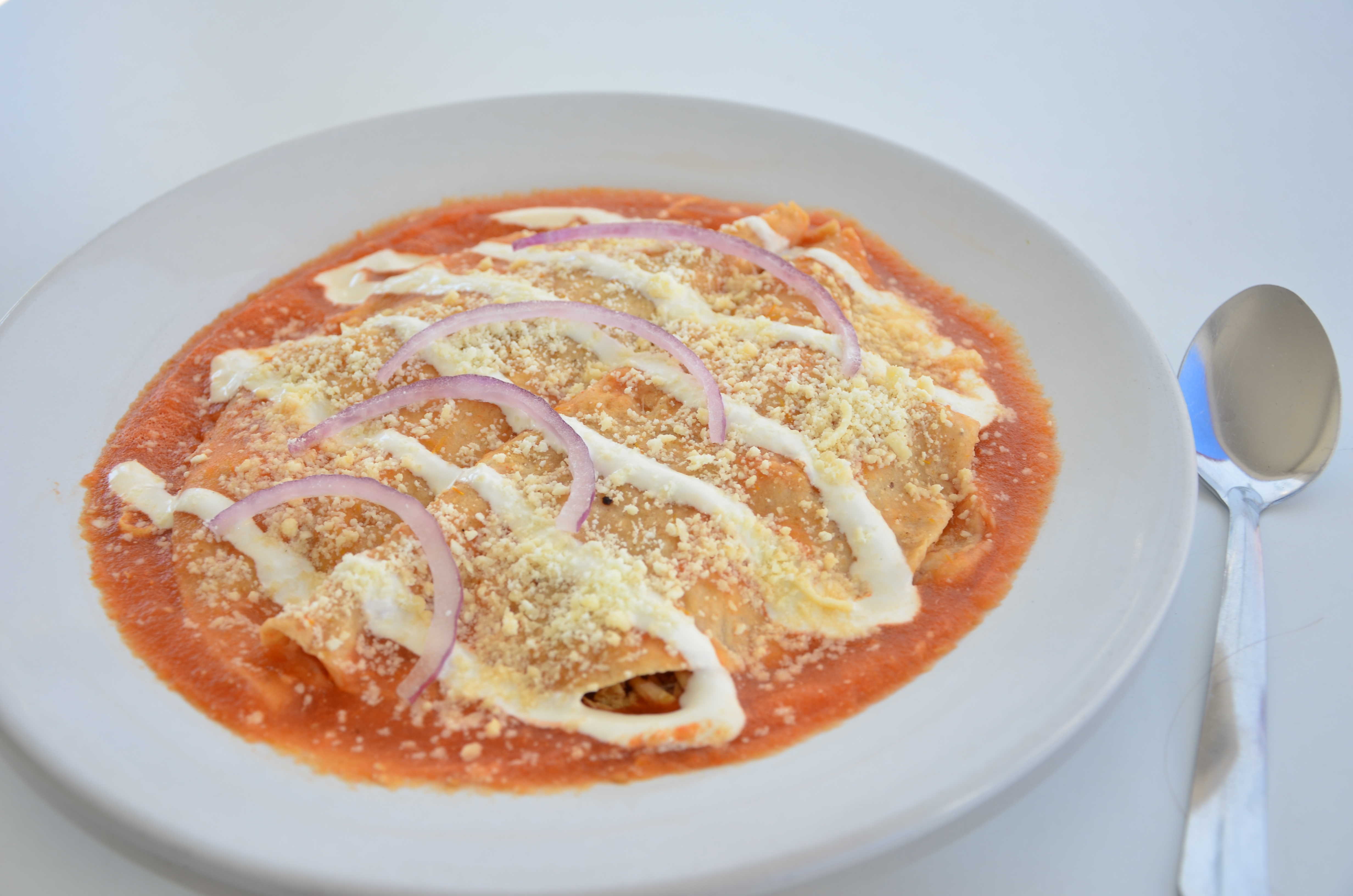 Entomadas acompañadas con pollo o requesón, cebolla, queso panela y crema.