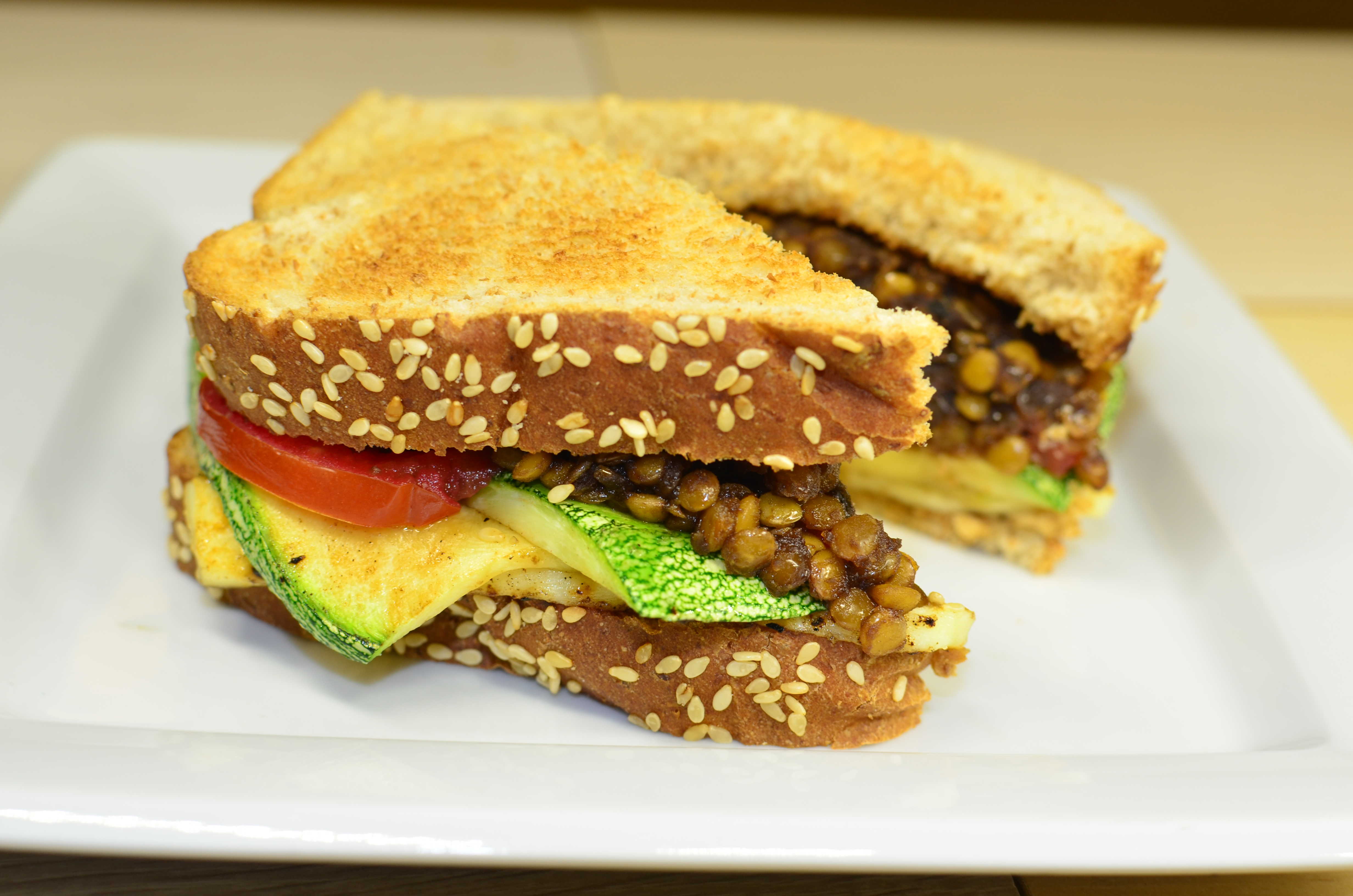 Pan integral tostado, lentejas preparadas con vinagre balsámico, ajo, perejil, queso panela, jitomate y láminas de calabacita a la plancha.