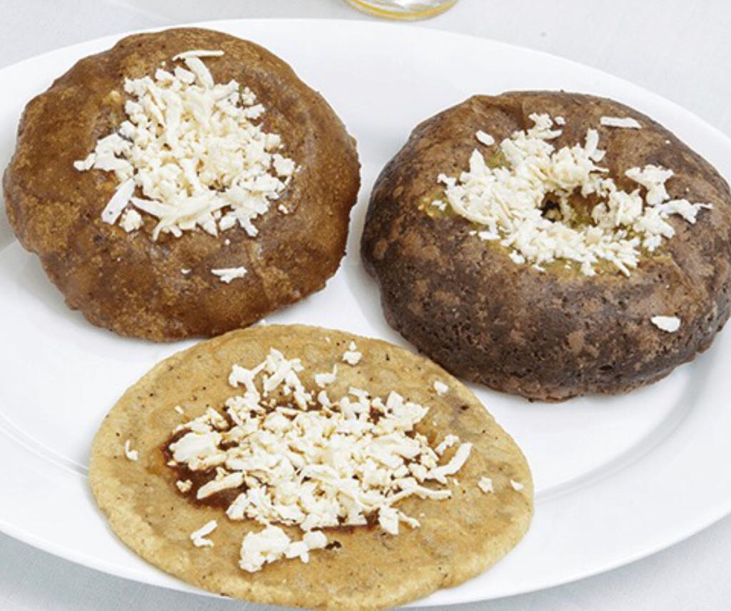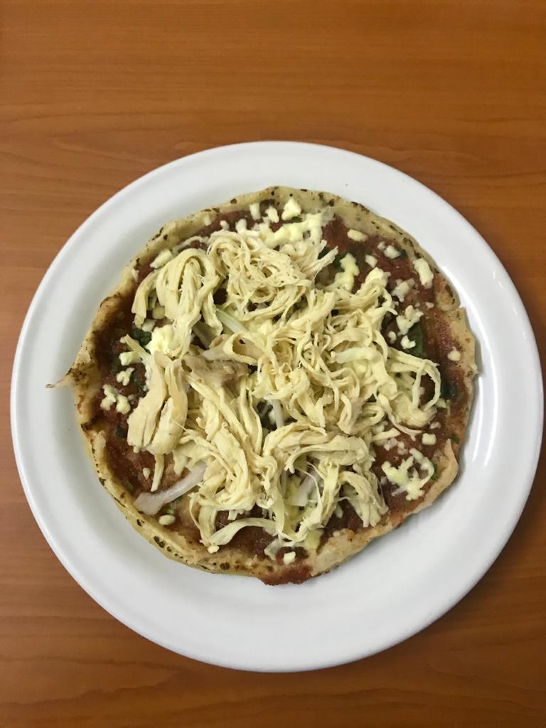 Tortilla cocida al comal y sobre ella la salsa de su elección, queso fresco y cebolla cruda.