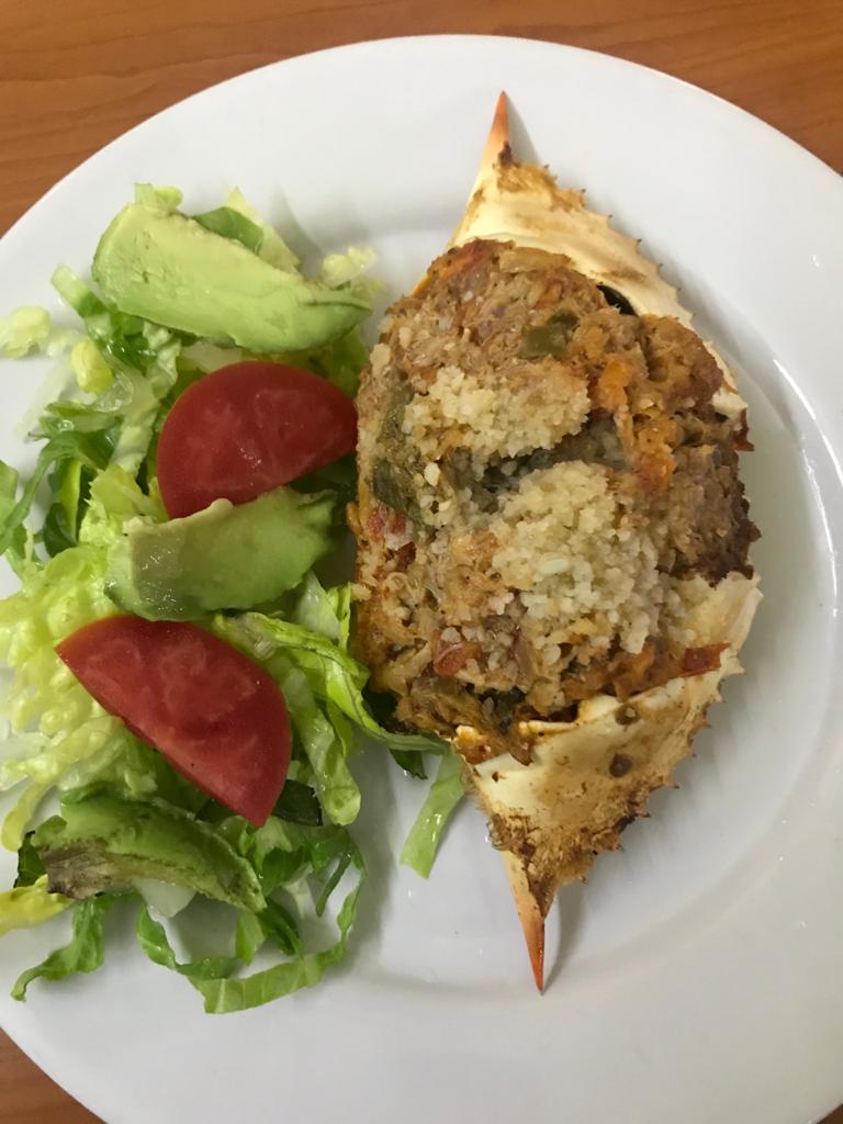 Pulpa de cangrejo guisado con tomate, cebolla, cilantro, aceitunas, alcaparras, orégano y laurel.