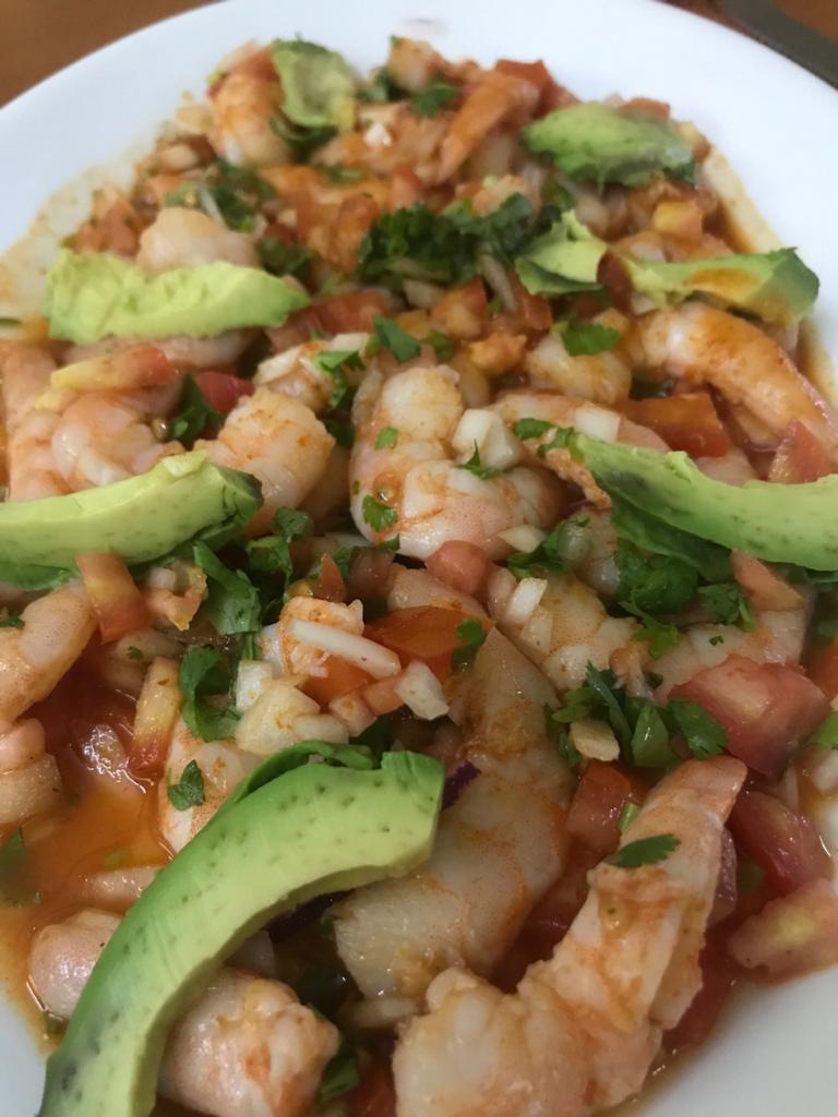 Mezcla de mariscos picados con salsa picante, salsa cátsup, cebolla, cilantro, aguacate y aceite de oliva.