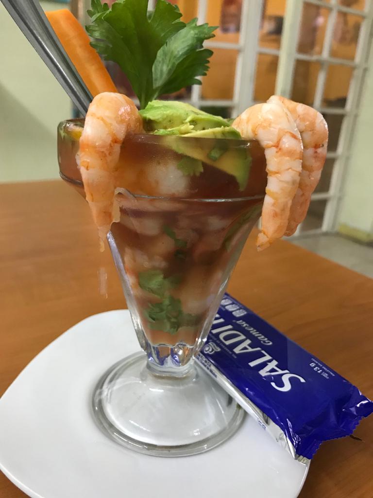 Mariscos cocidos picados con salsa picante, salsa cátsup, cebolla, cilantro, aguacate y aceite de oliva.