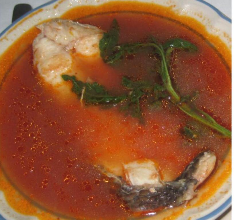 Caldo preparado con salsa de tomate, epazote, chiles y robalo.