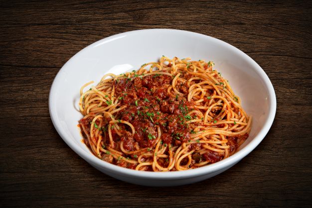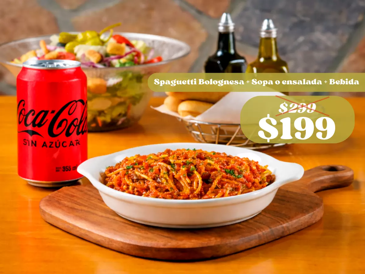 Deliciosa pasta spaguetti bañada en nuestra salsa tradicional de carne. Incluye Pannolis, sopa o ensalada, más una bebida a elegir.