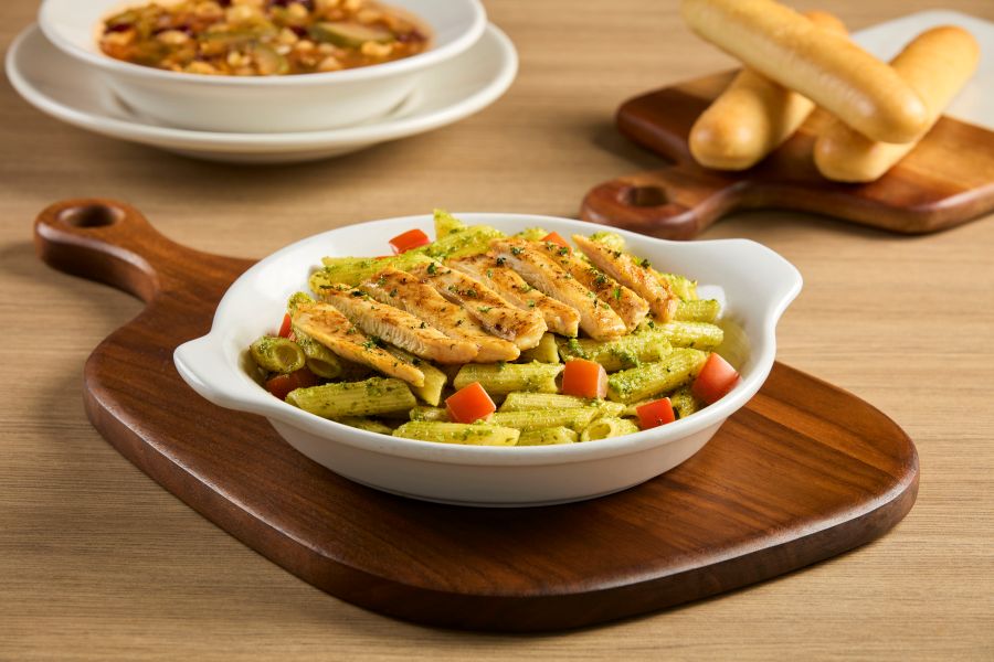 Pasta Penne con salsa pesto hecho en casa, pollo (170 gr) y tomate fresco sazonado con ajo. Incluye Pannolis, sopa o ensalada mas una bebida a elegir.