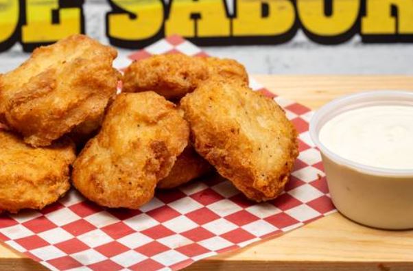 Crujientes nuggets de pechuga de pollo. Ración de 8 unidades. Incluye salsa de ajo.