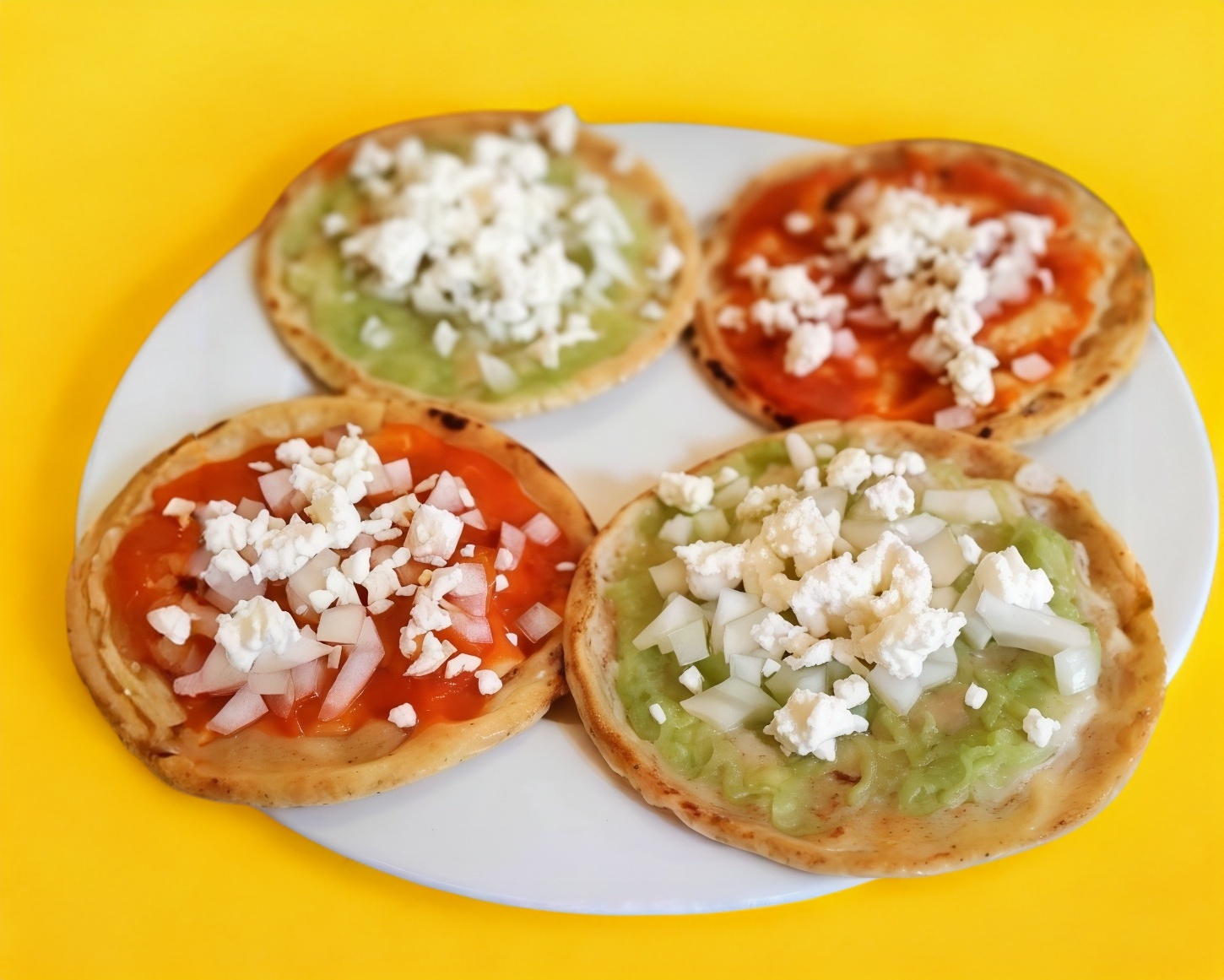 Tortilla de Maíz con Bordes Cocinado al Comal con Ingrediente a Elegir y Salsa de su Elección. Preparada con Media crema, Cebolla y Aguacate.
