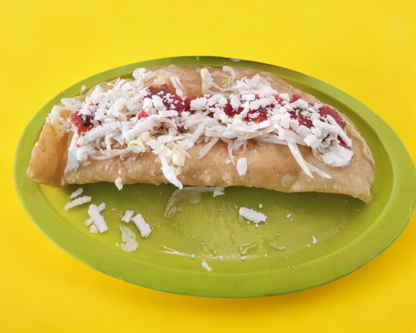 Tortilla de maíz de frijol, frita e inflada, preparada con queso, crema y salsa de tu elección.