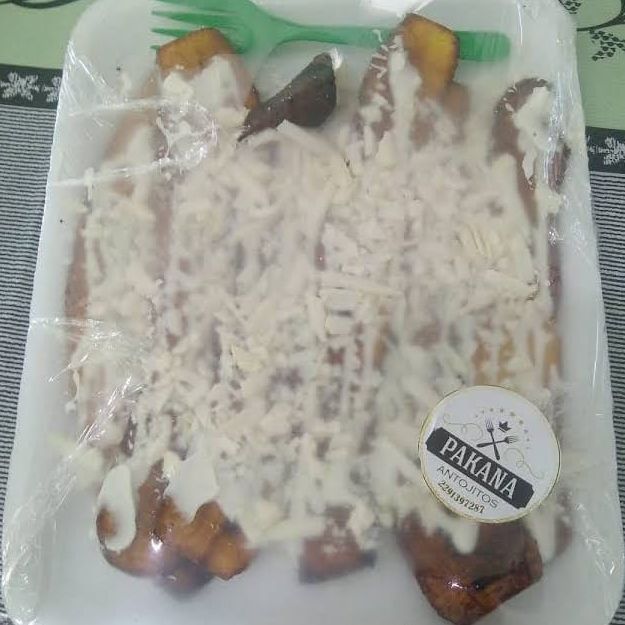 Plátanos machos en rebanadas fritas con queso y crema.
