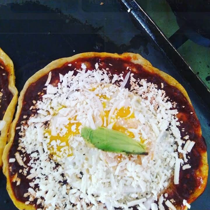 Base de frijol refrito con cebolla sitronada con pollo guisado, catsup, chiles en raja, huevo cocido y aguacate.