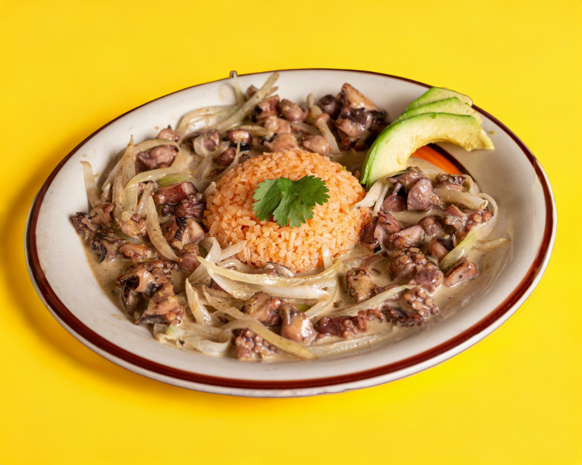 Elegir 1 estilo: encebollados, enchipotlados, mojo de ajo ,a la crema (todos con arroz).