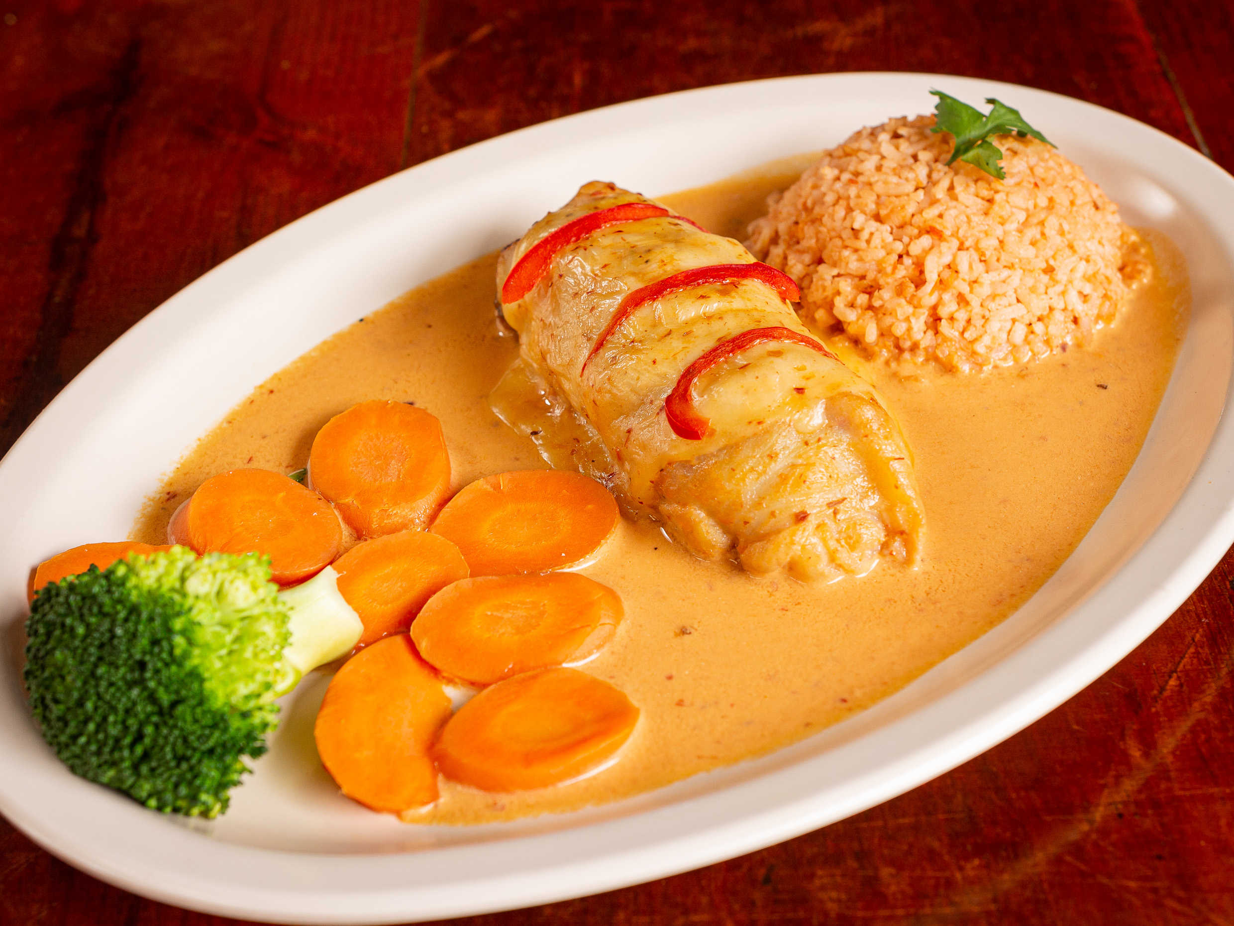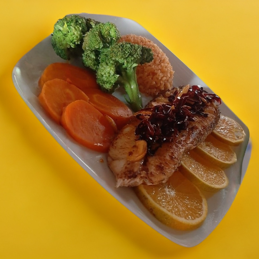 Bañado en aderezo de crema con chipotle acompañado de arroz, brócoli y zanahoria.