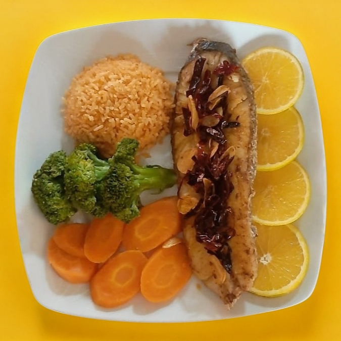 Acompañado con pepino, brócoli, zanahoria, arroz.