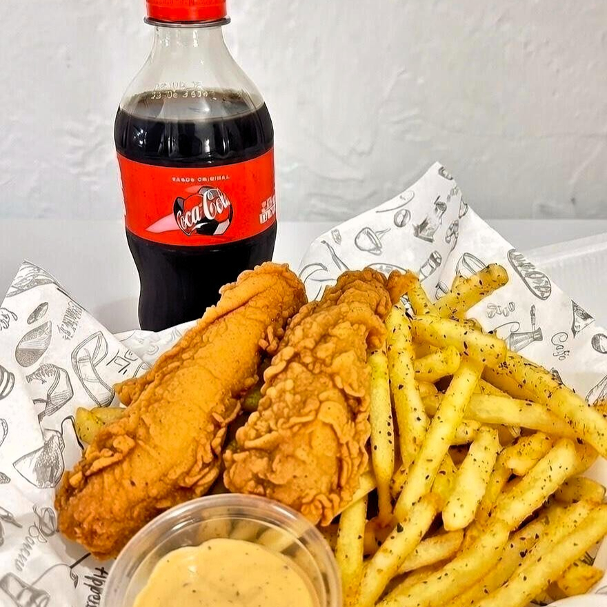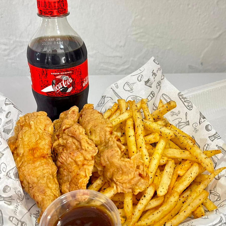 2 tenders grandes, 200 gr de papas a la francesa, un refresco de 355ml. y un aderezo