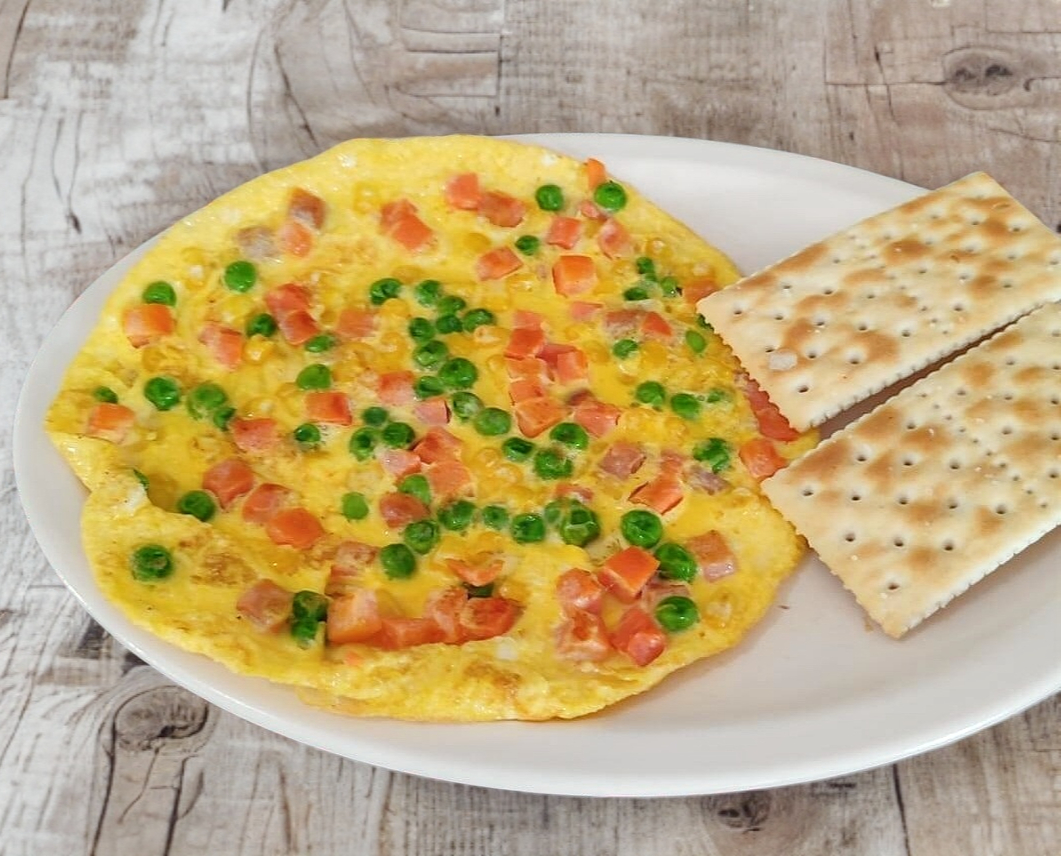 Delicioso omelette con mezcla de vegetales, acompañados de salmas o galletas saladas.