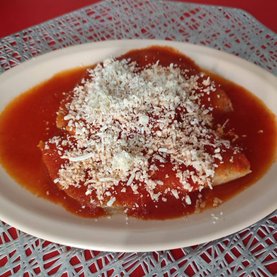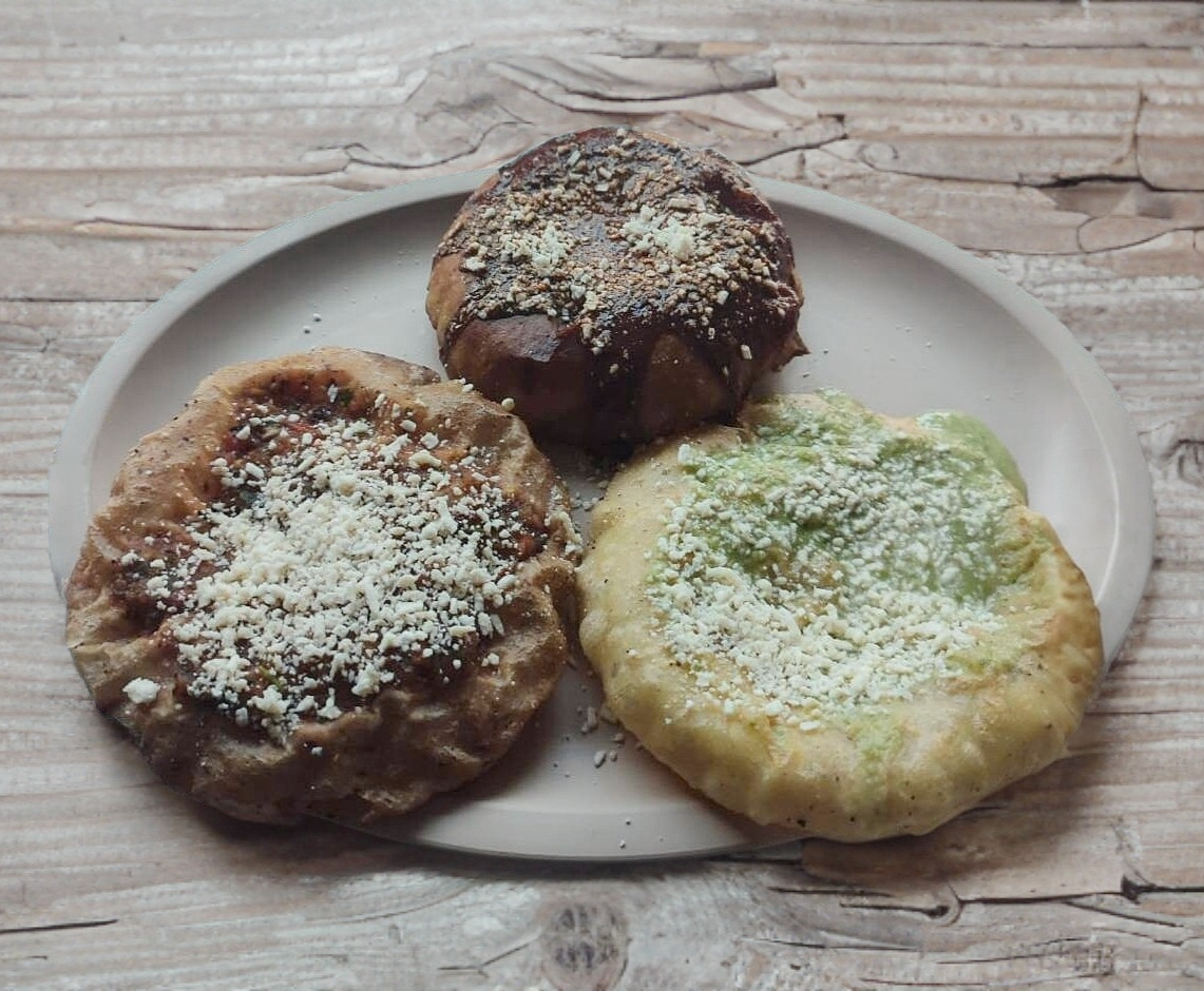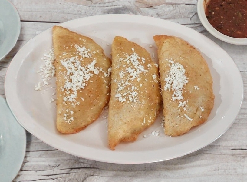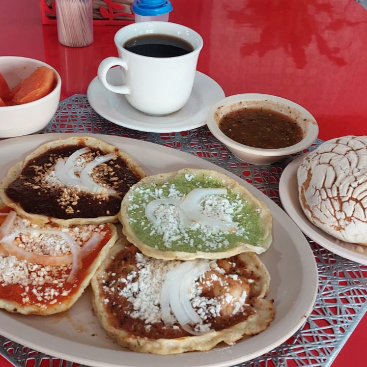 Deliciosas entomatadas rellenas (4 piezas). Incluye café, fruta y pan dulce.