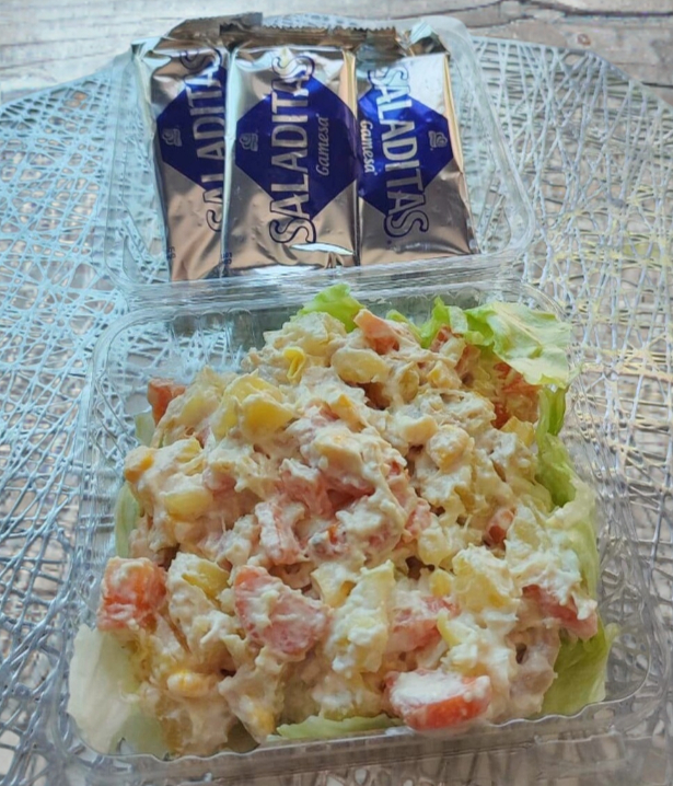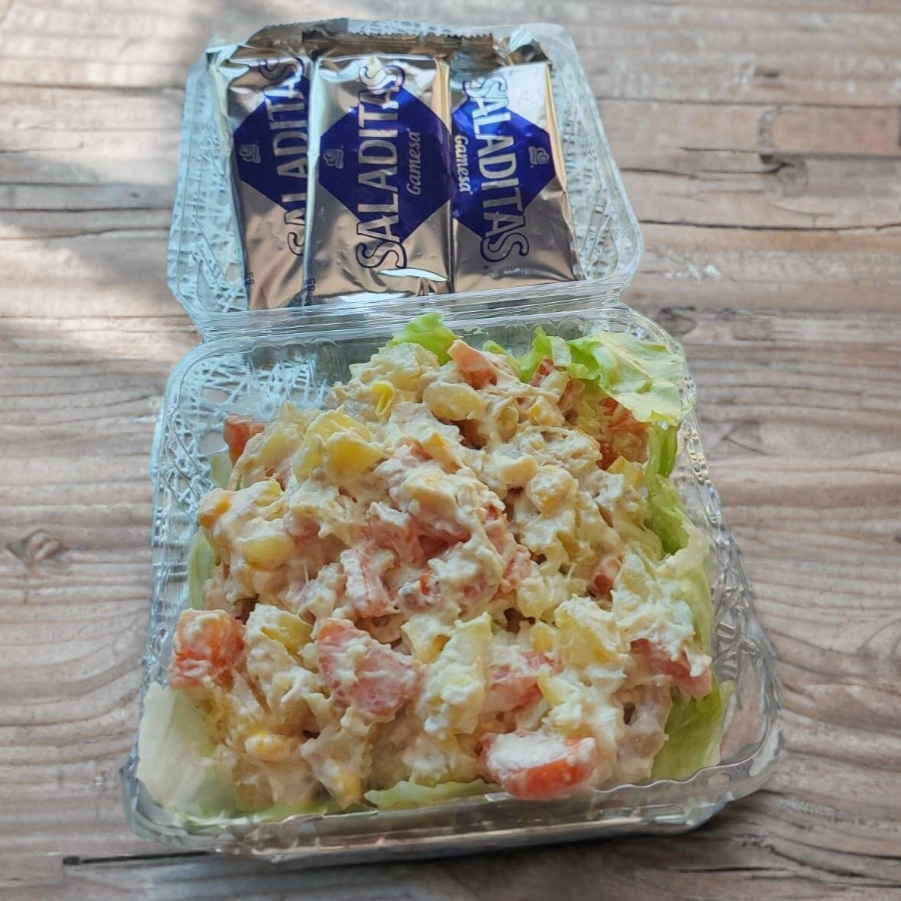 Deliciosa ensalada con papa, zanahoria, pollo y aderezos.