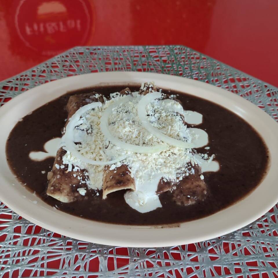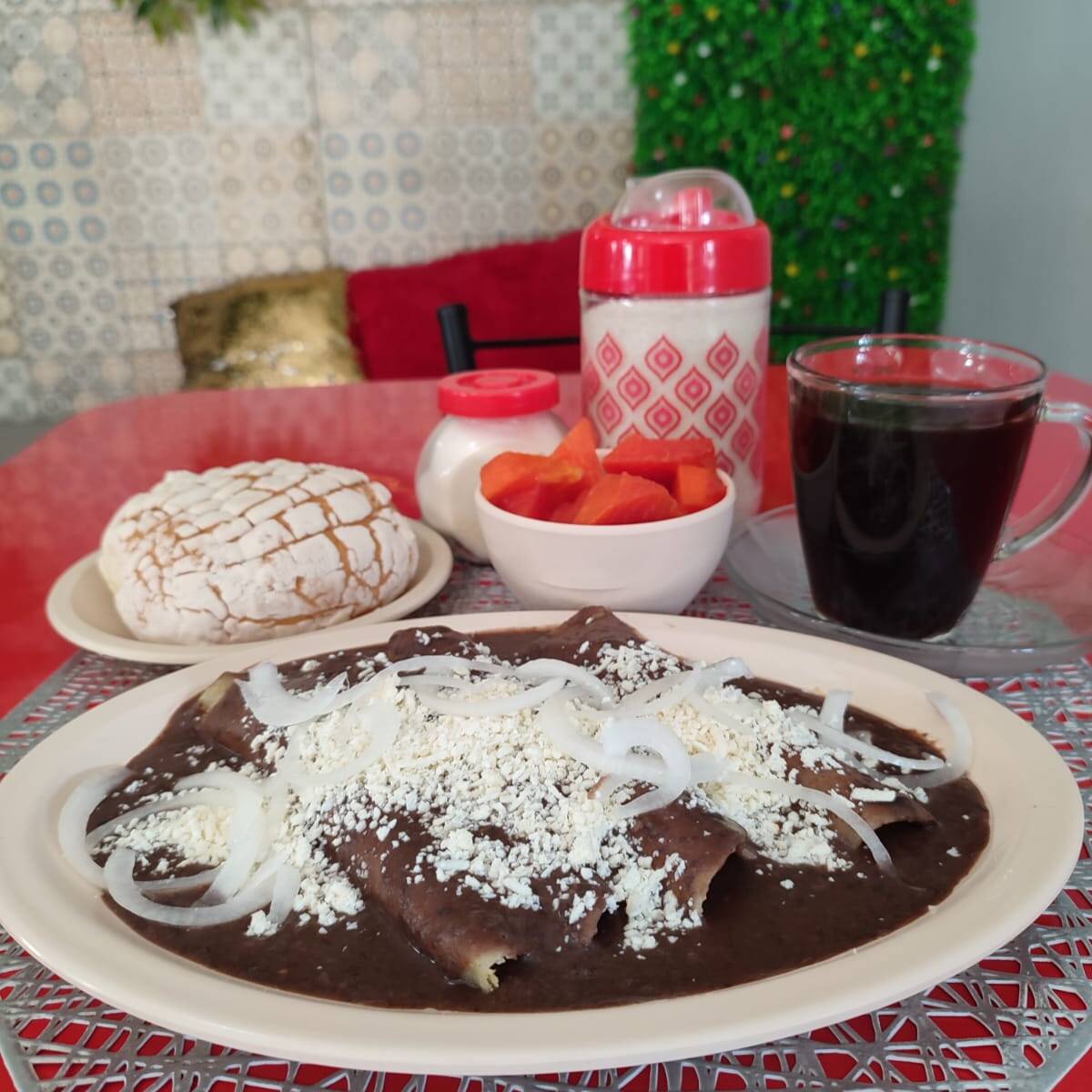 Deliciosas enfrijoladas rellenas (4 piezas). Incluye café, fruta y pan dulce.