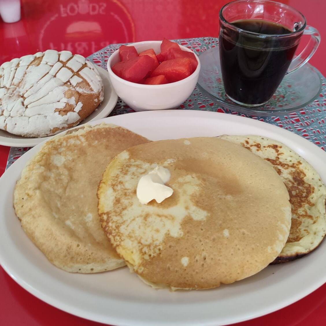 3 Piezas de hot cakes. Incluye café, fruta y pan dulce.