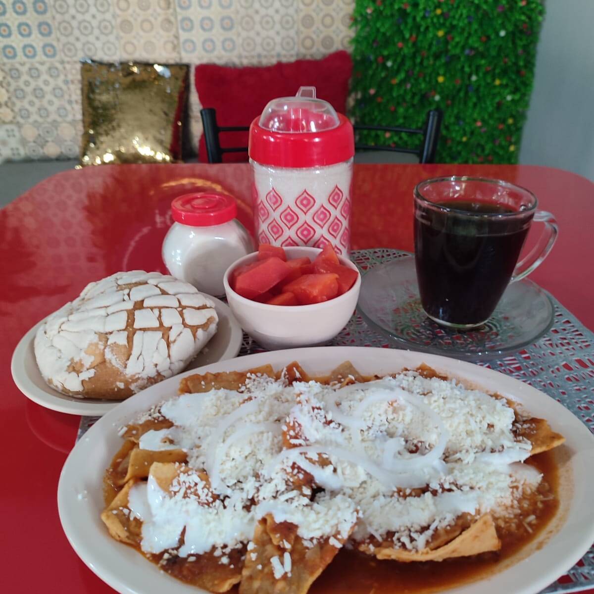 Chilaquiles con huevo, pollo o bistec. Incluye café, fruta y pan dulce, acompañado de frijoles.