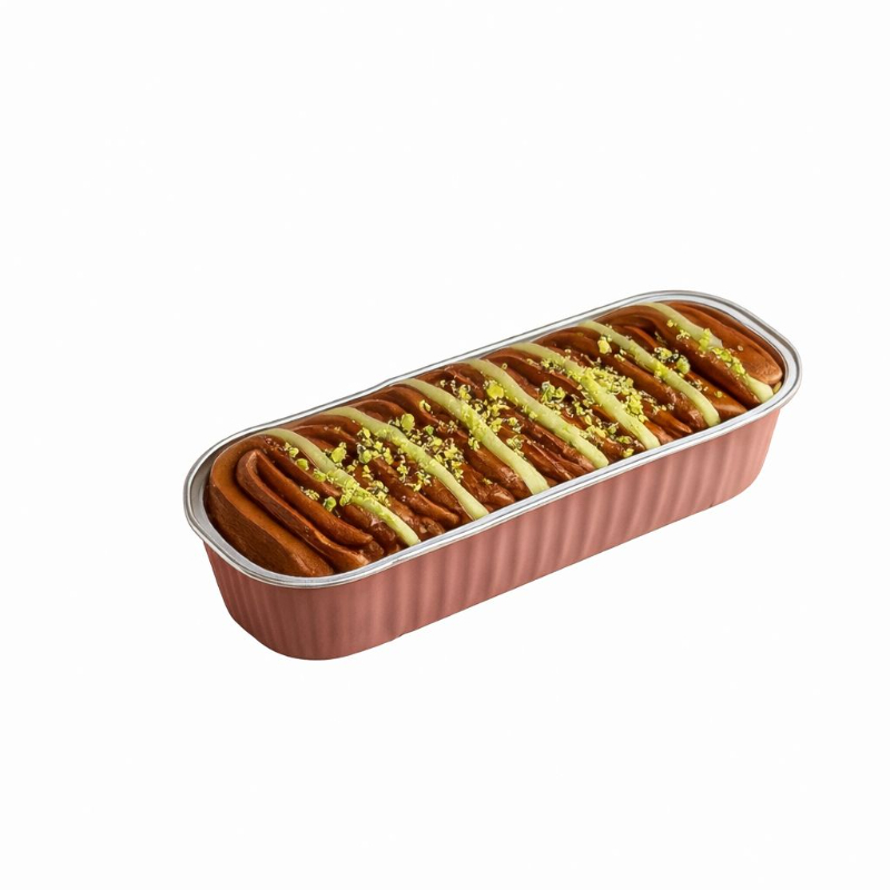 Base de bizcocho de chocolate con relleno de crema de pistache, cobertura cremosa de chocolate pistache y topping de pistache triturado