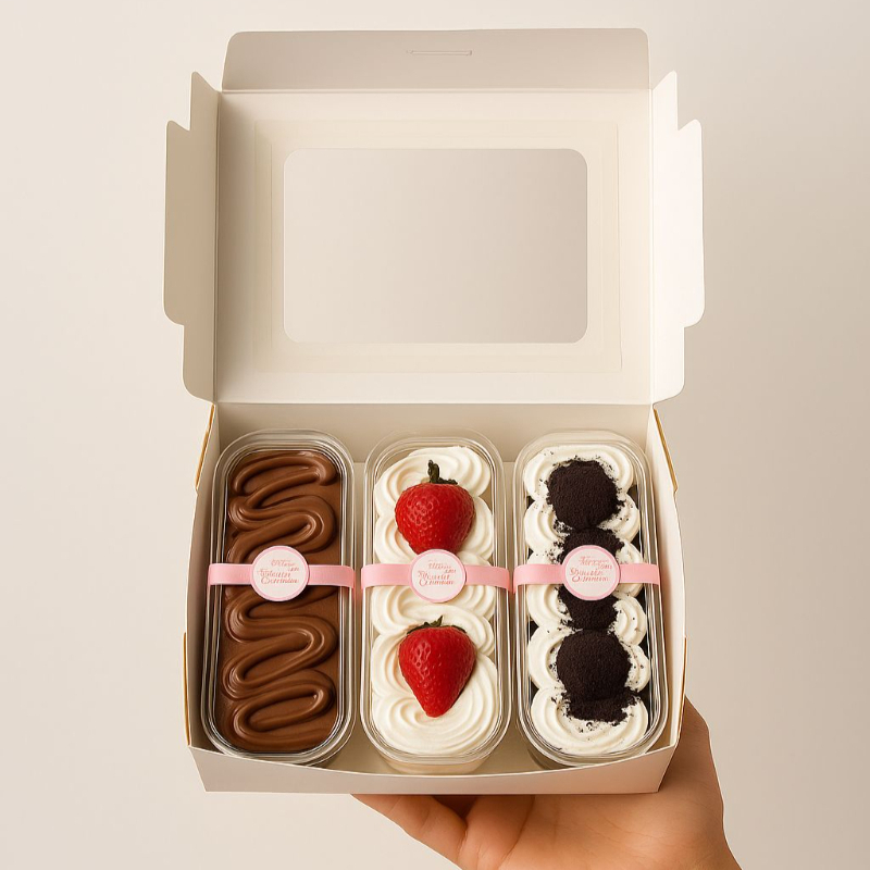 Incluye 3 mini pasteles Chunk Cake con sabores surtidos. Ideal para regalar o consentirte. Puedes agregar una velita y nota personalizada.