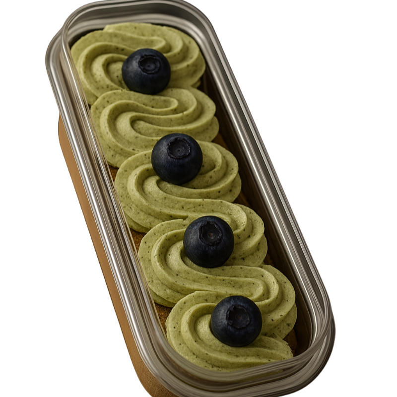 Original base de pastel sabor vainilla cubierto de crema de matcha y moras