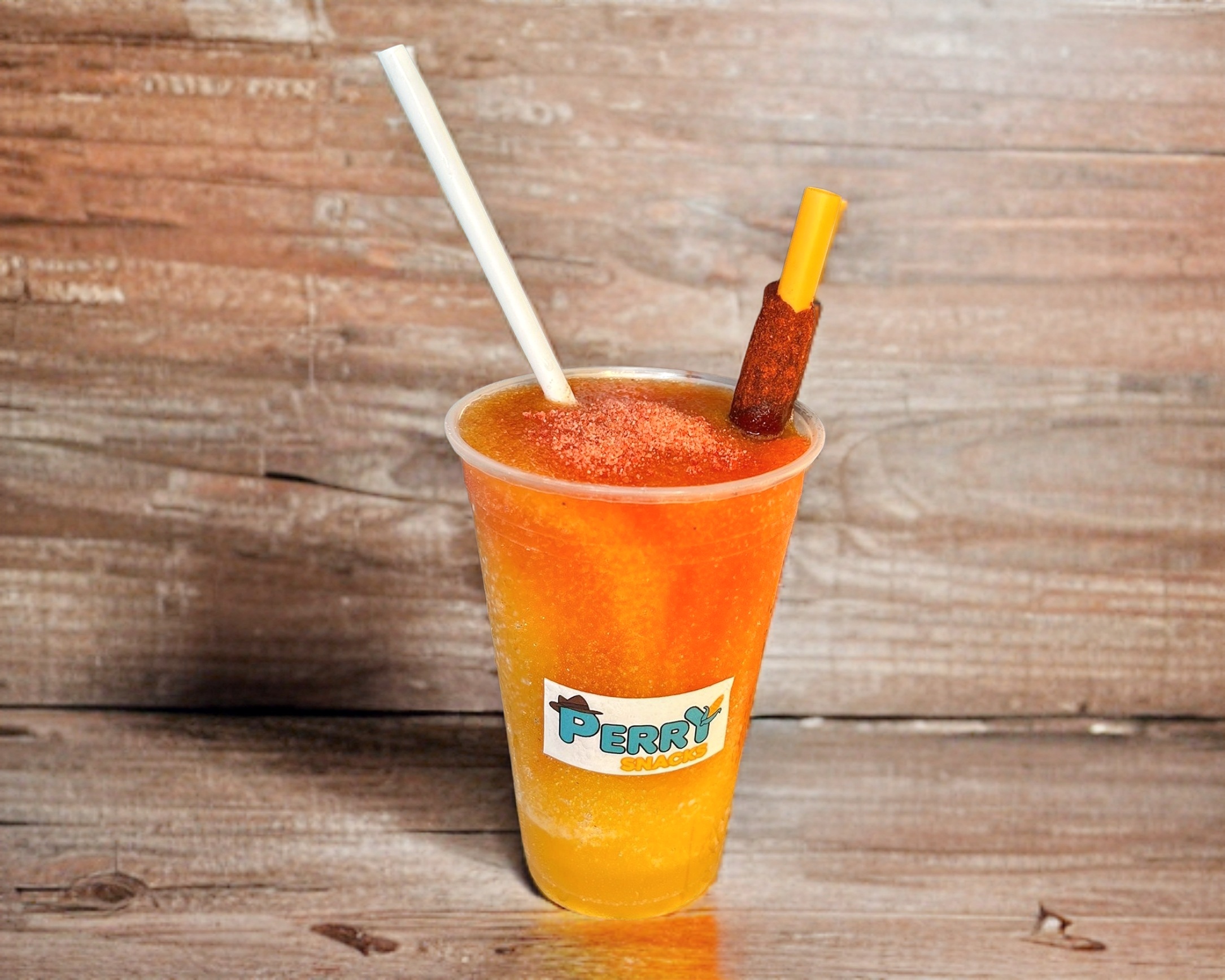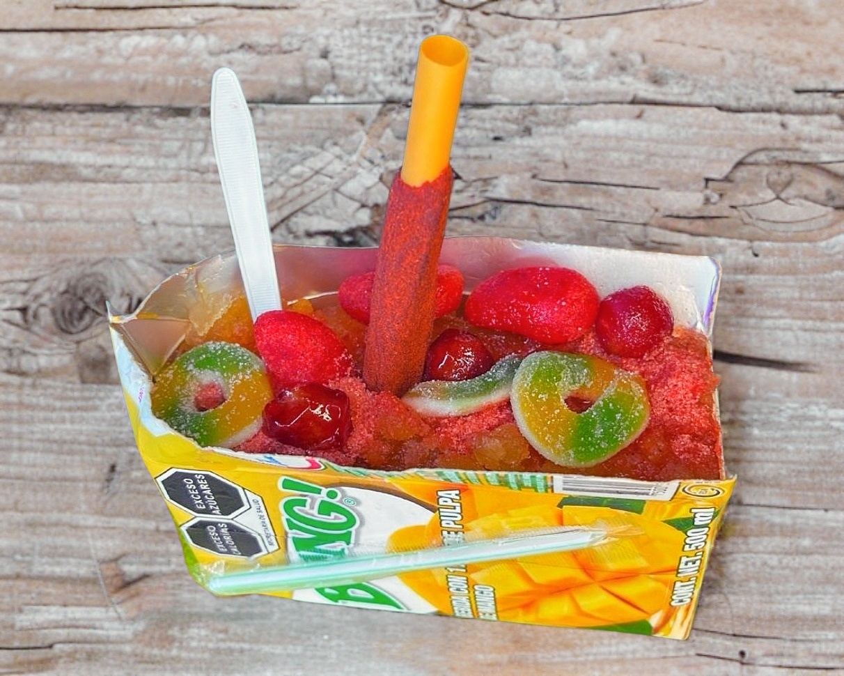 Frappé sabor mango, servido con chamoy, miguelito y paleta de tamarindo.