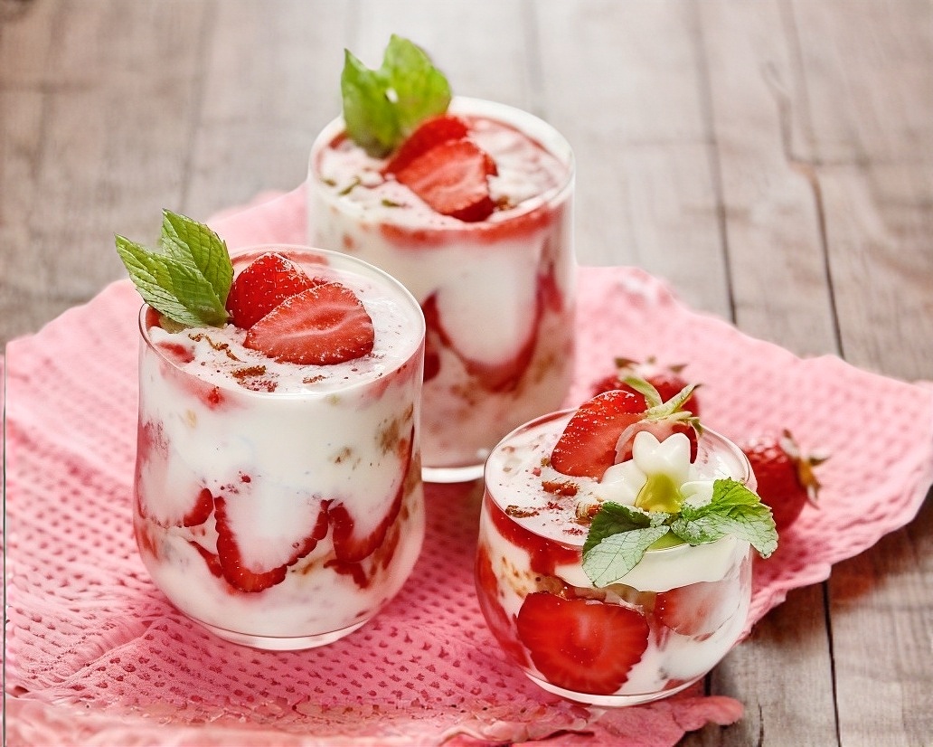 Fresas congeladas, servidas con crema preparada receta de la casa y granillo sabor chocolate como topping.
