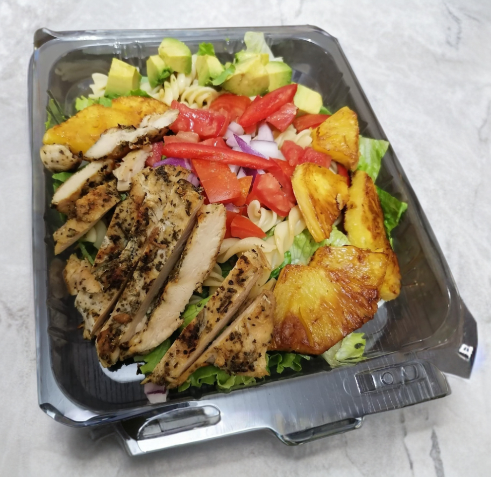 Mezcla de lechuga, pasta Fusilli, tómate, aguacate, cilantro, cebolla, pepino, piña asada, pechuga asada y aderezo.